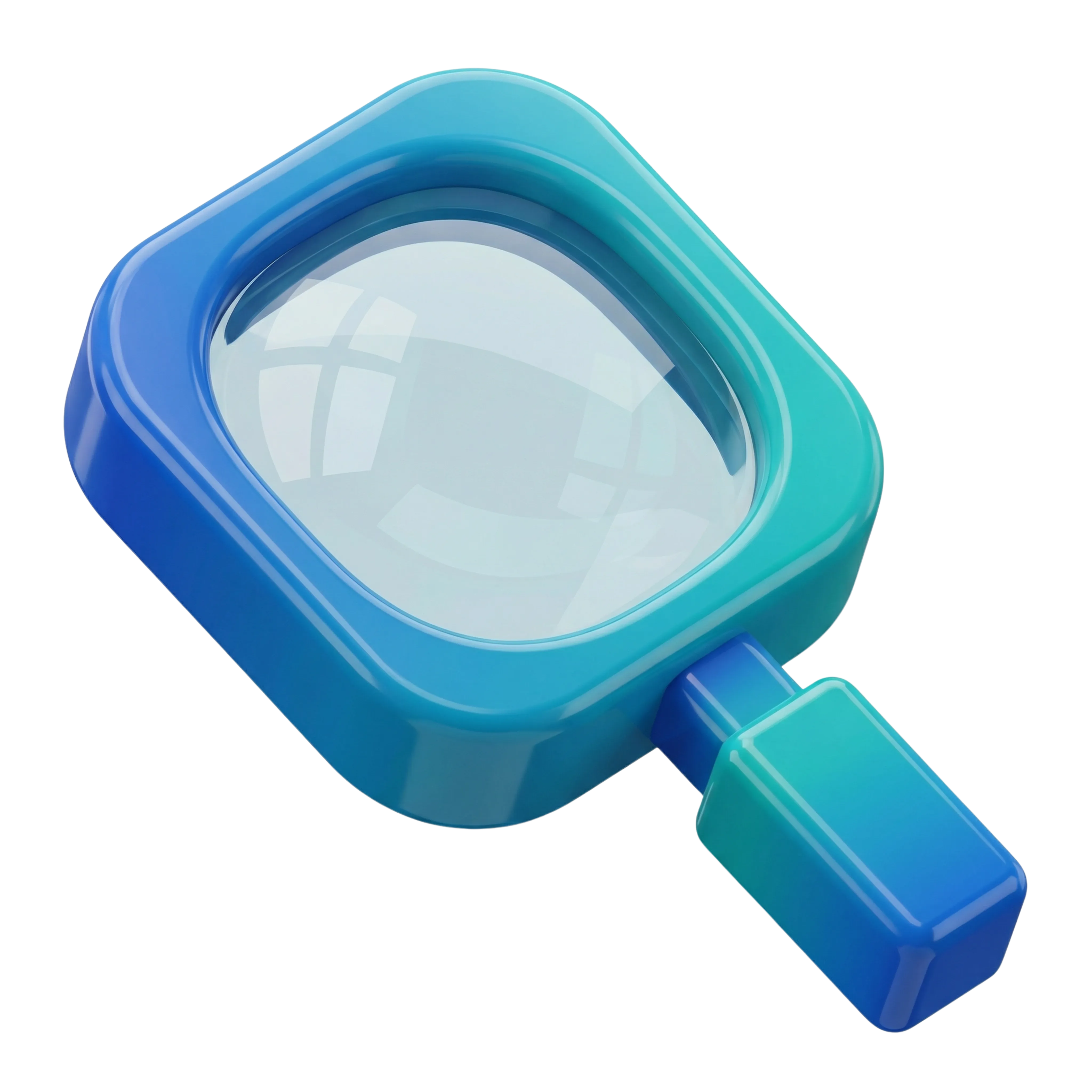مجسم ثلاثي الأبعاد عالي الدقة لأيقونة بحث عصرية بلمسة زرقاء لامعة وعدسة مكبرة ناعمة، مثالية لتصاميم واجهات المستخدم والتطبيقات والعروض الرقمية.