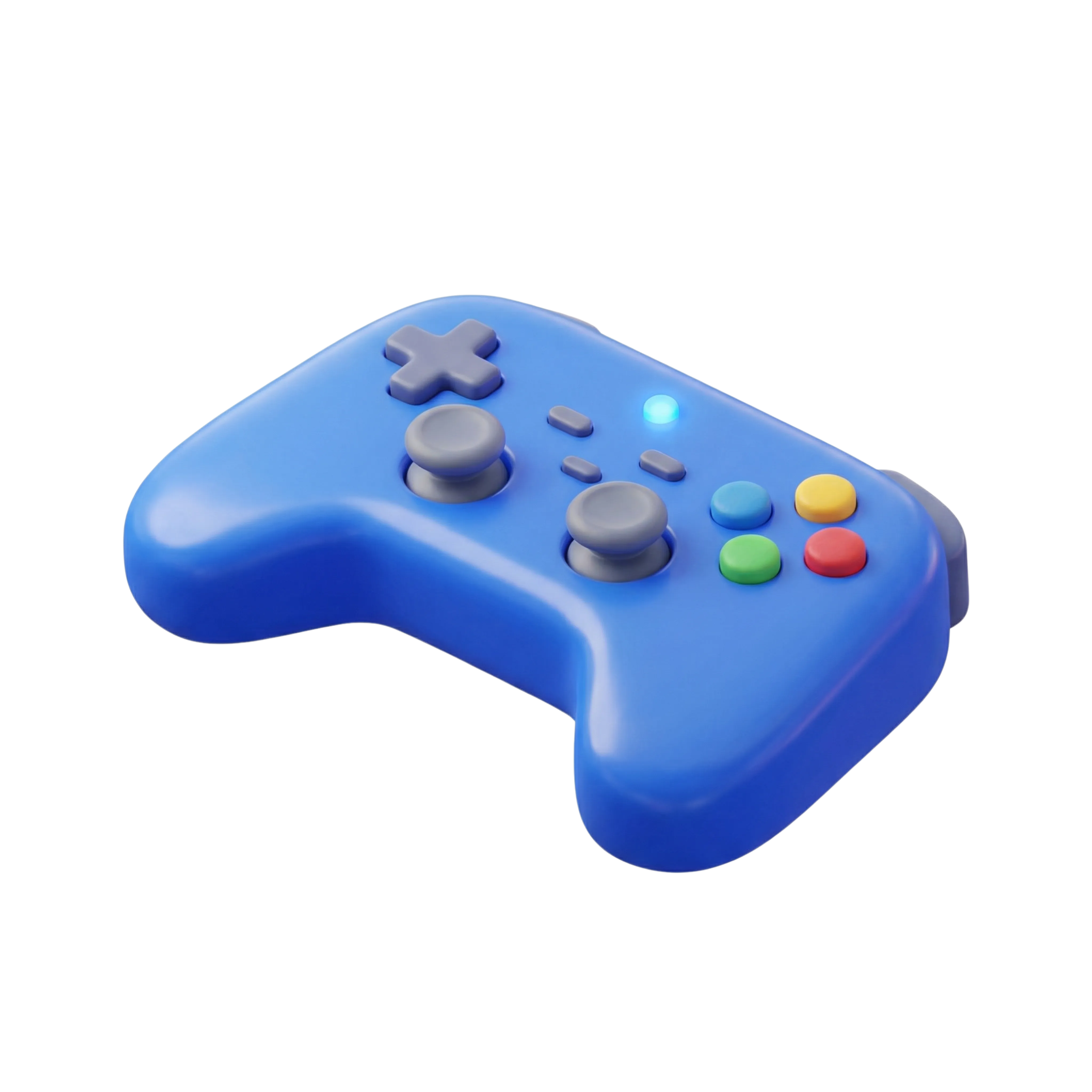 A high-quality 3D render of a modern game controller featuring a glossy plastic finish, vibrant buttons, and dual analog sticks. This stylized model is ideal for use in UI design, gaming platforms, apps, and digital content related to entertainment and technology.