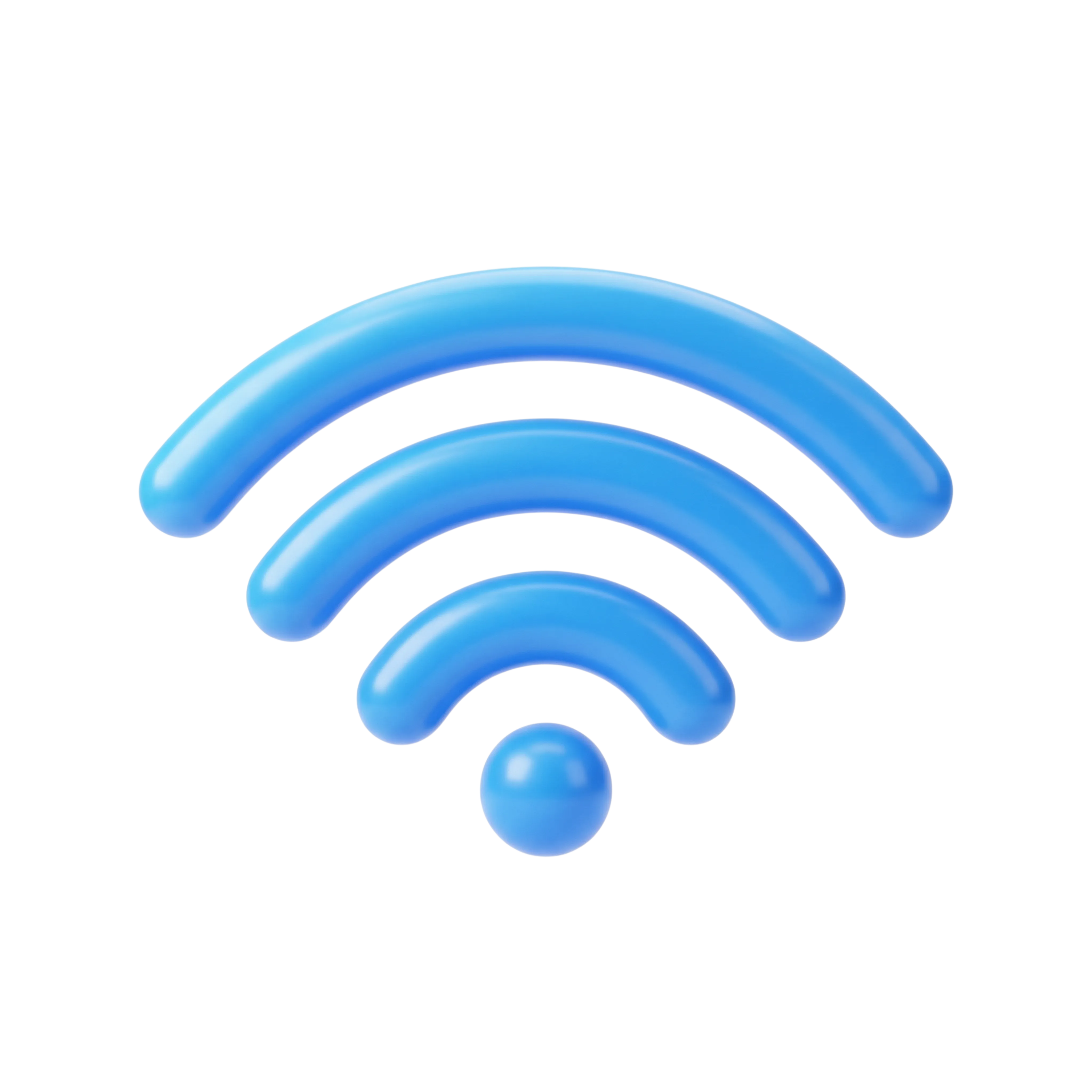 مجسم ثلاثي الأبعاد عالي الدقة لأيقونة إشارة الواي فاي بسطح أزرق لامع وناعم. مناسب لتصاميم واجهات الاستخدام والرسوم التوضيحية التقنية وتطبيقات الاتصال اللاسلكي.
