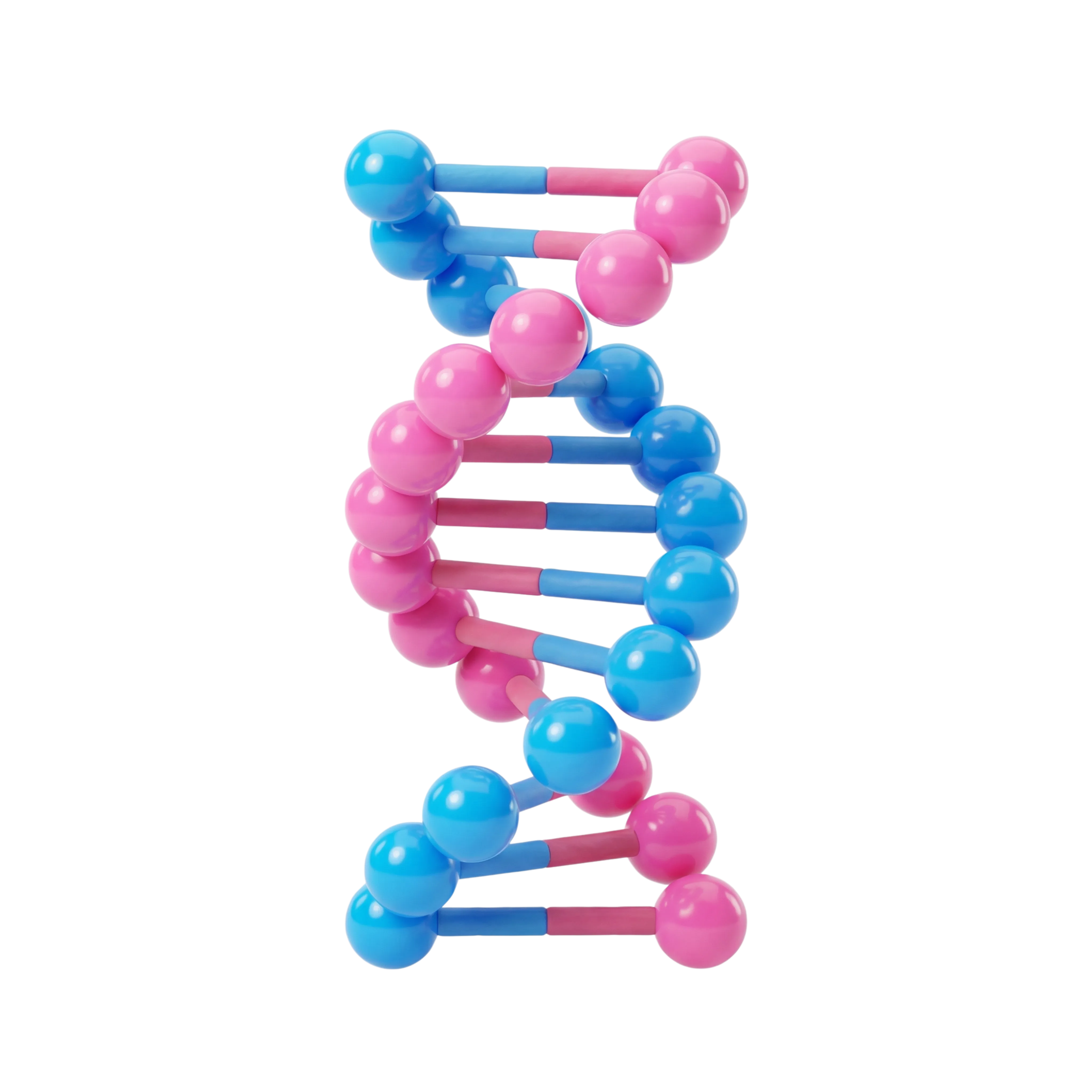 A vibrant 3D illustration of a DNA double helix made of glossy spheres and rods in pink and blue tones. This stylized model is suitable for science, medical infographics, educational apps, and biotechnology branding. It emphasizes molecular structure with a playful yet precise design.