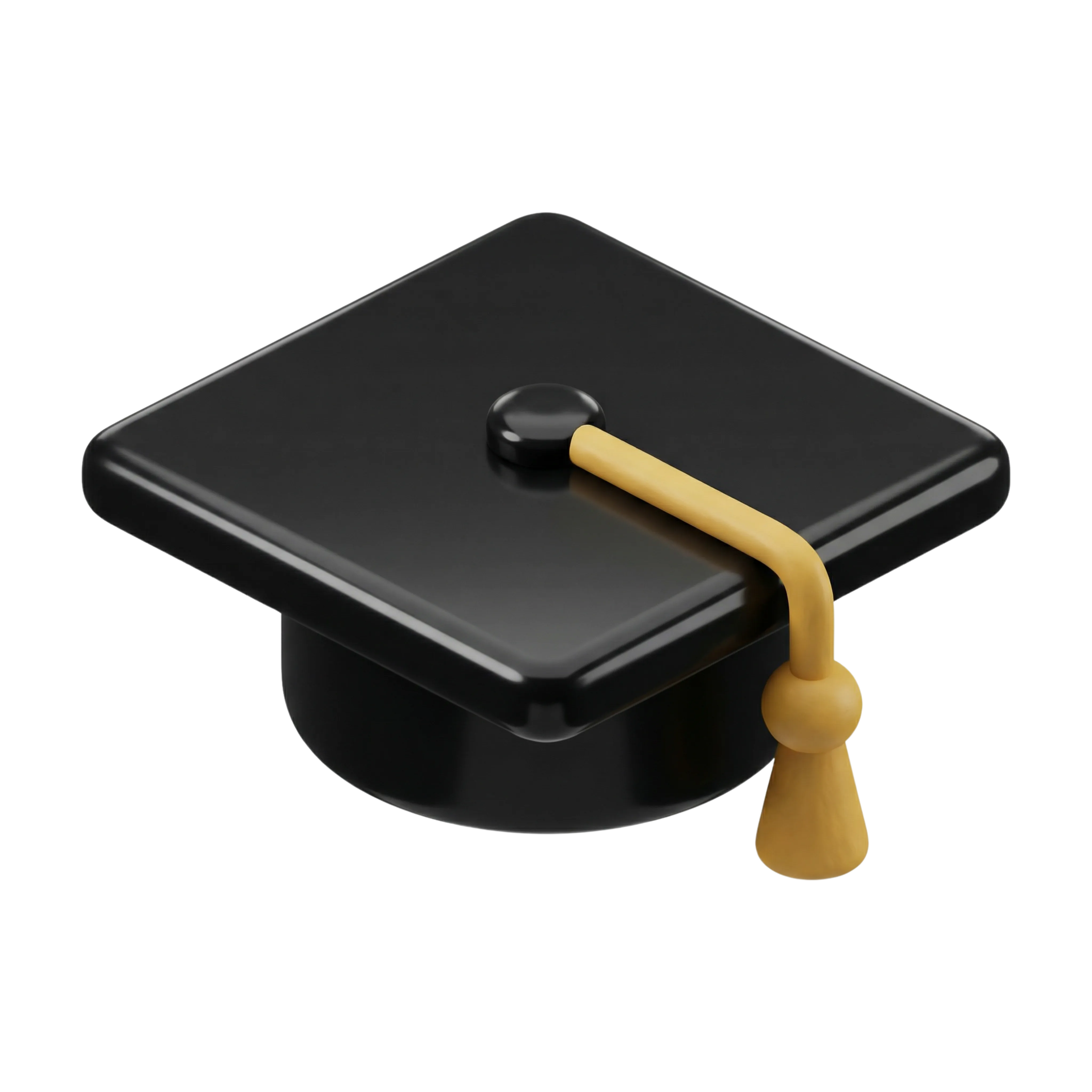 A high-quality 3D model of a traditional graduation cap rendered in a sleek, glossy black material with a golden tassel. Ideal for use in educational graphics, academic platforms, mobile apps, or celebratory designs related to graduation events.