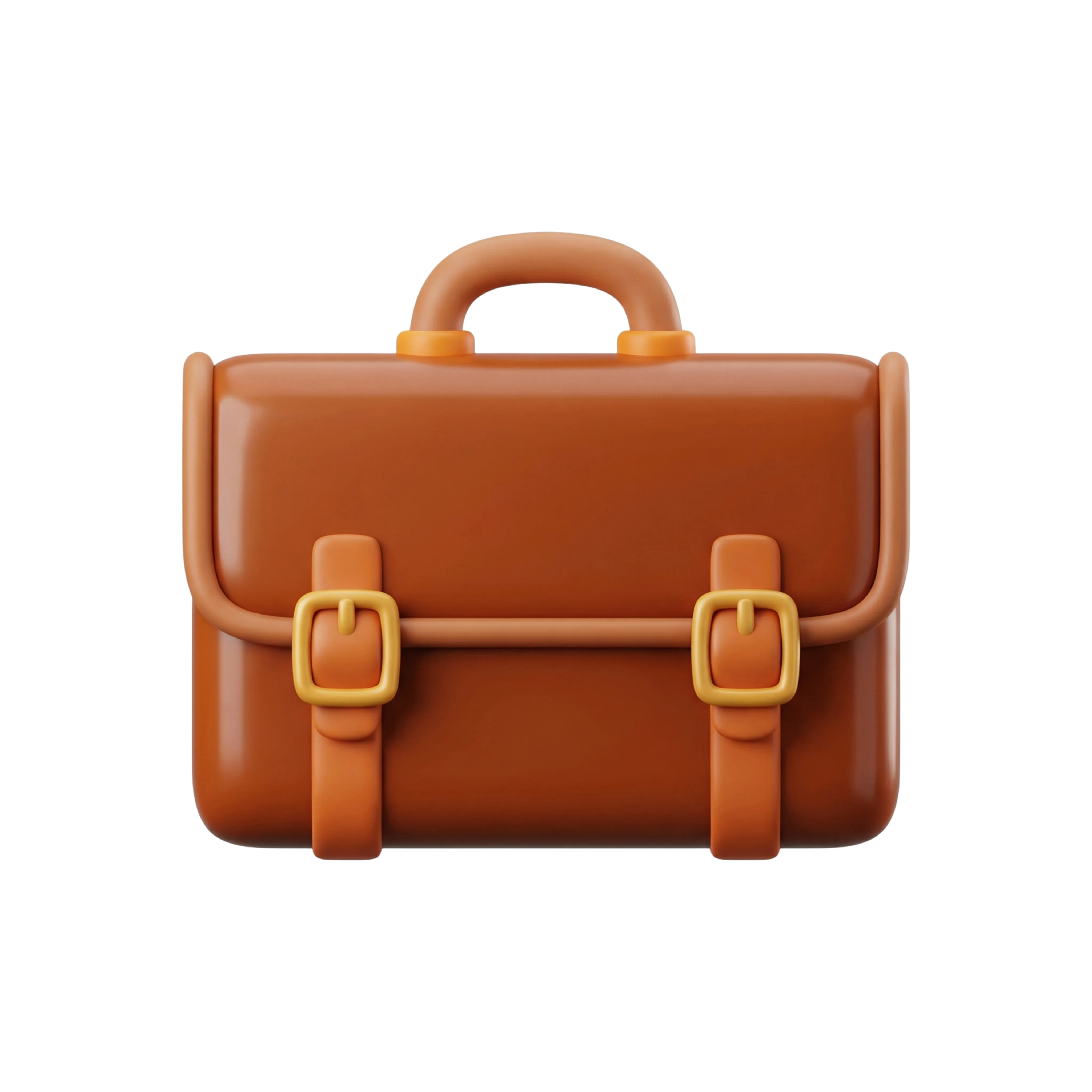 A high-quality 3D icon of a closed leather briefcase with a smooth glossy finish and golden buckle details. Ideal for professional, business, education, or office-related digital interfaces, infographics, or UI design.
