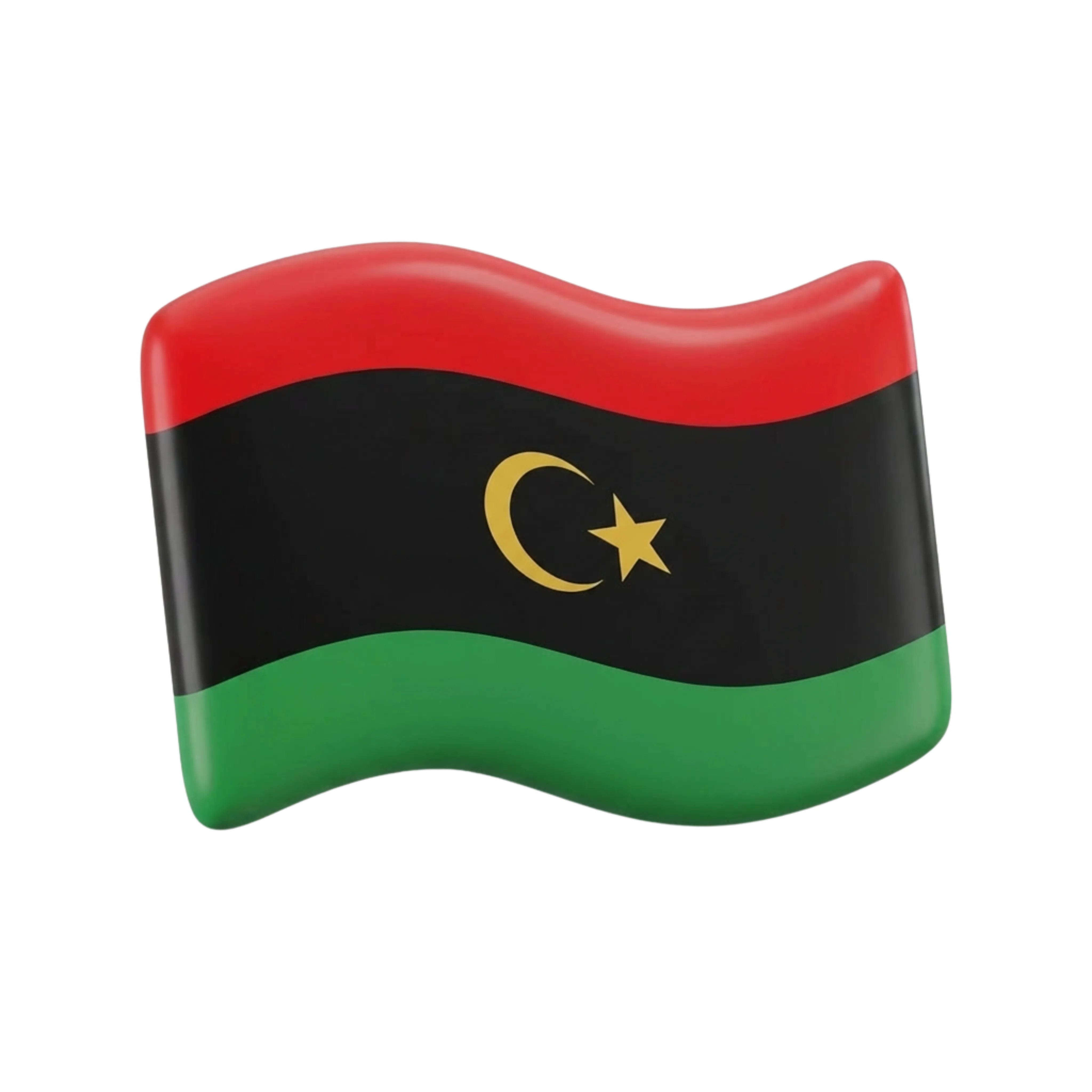 رمز ثلاثي الأبعاد عالي الجودة لعلم ليبيا بملمس لامع وشكل متموج يوحي بالحركة والحيوية. مثالي للاستخدام في العروض التقديمية، المواد التعليمية، عناصر واجهات المستخدم والتصاميم ذات الطابع الثقافي.