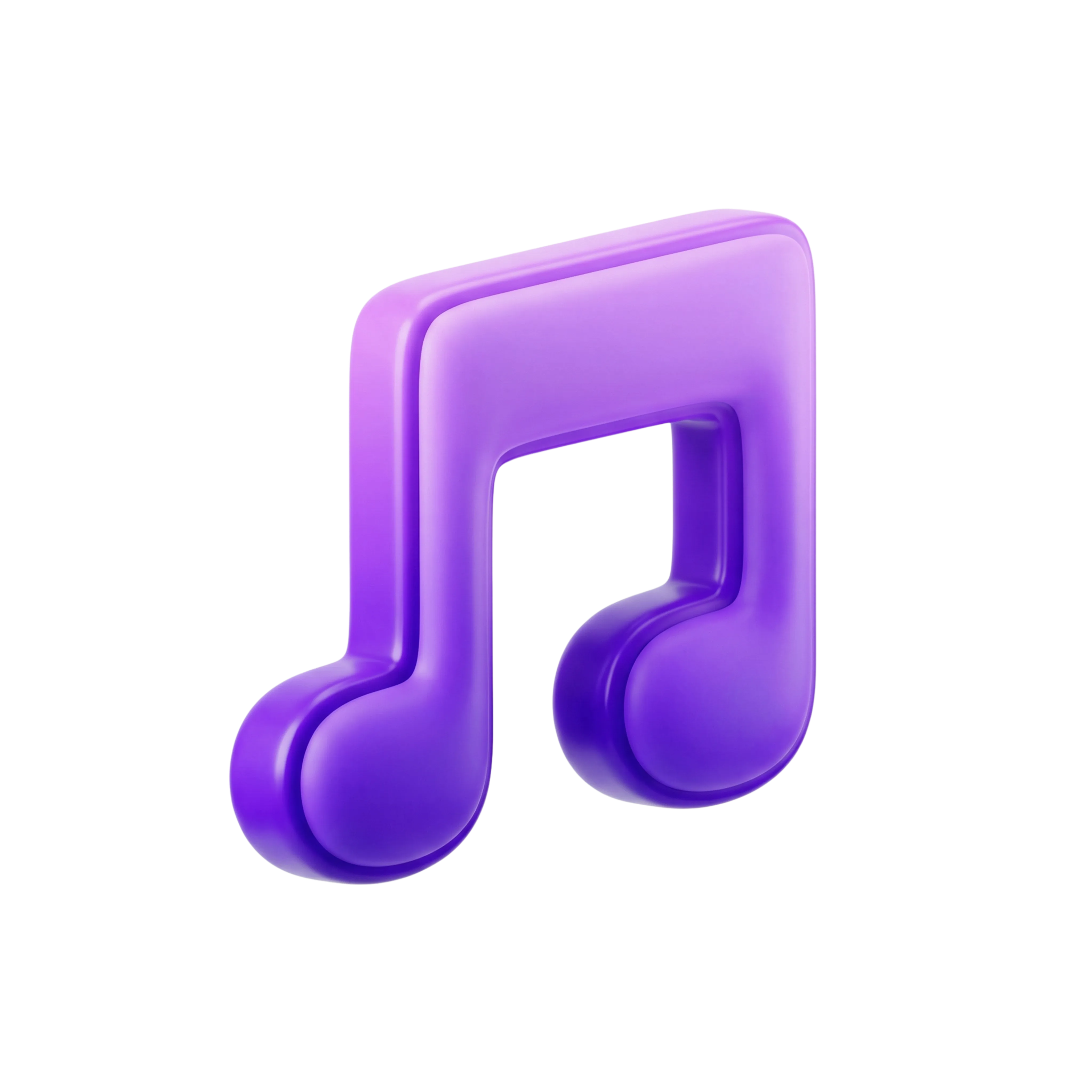 مجسم ثلاثي الأبعاد عالي الجودة لرمز نوتة موسيقية مصمم بلون بنفسجي لامع وحواف منحنية مع إضاءة ناعمة. مثالي لتصميم واجهات التطبيقات والمنصات الموسيقية والعلامات التجارية متعددة الوسائط.