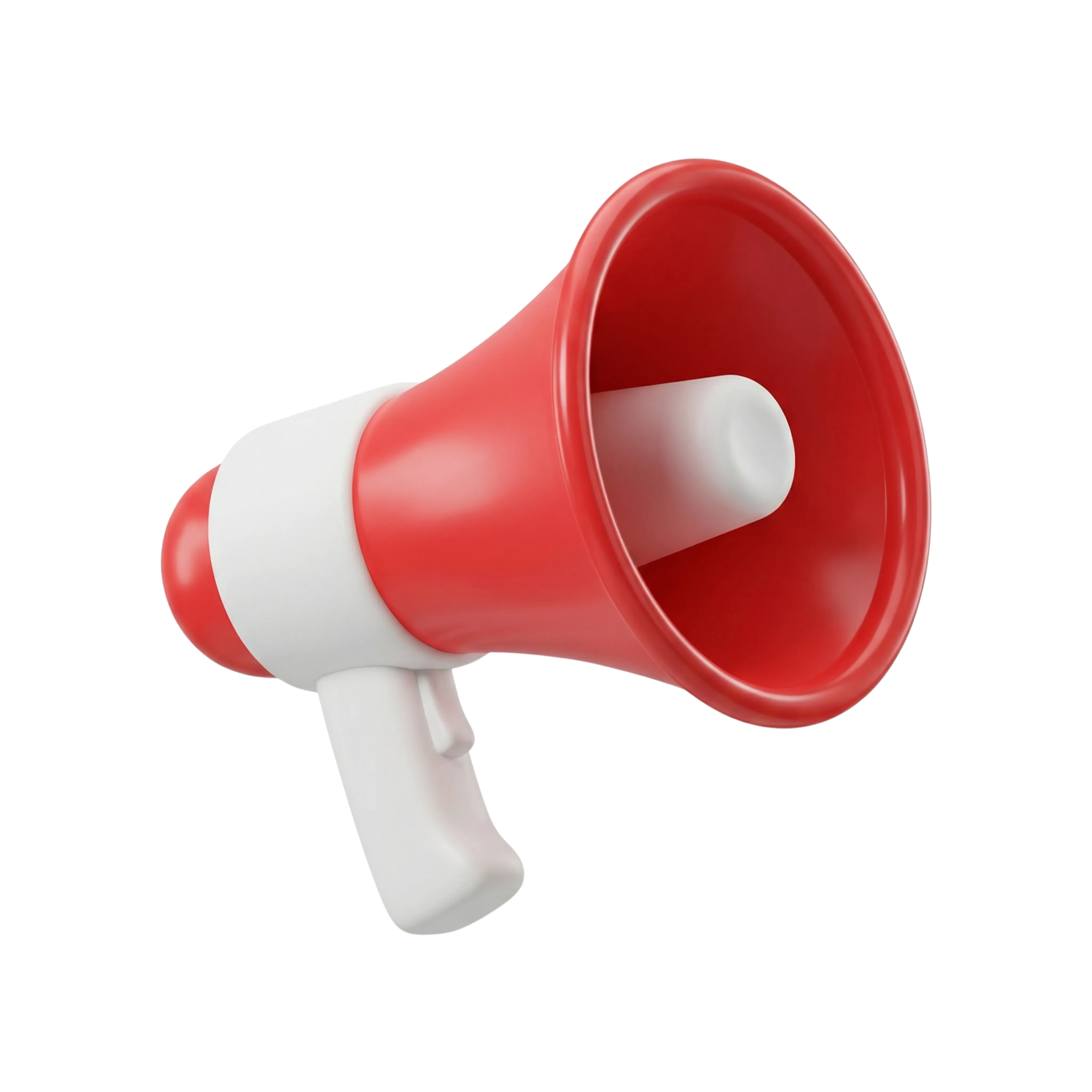 A high-quality 3D render of a red and white megaphone with a glossy plastic finish, commonly used to symbolize announcements, alerts, or public messages. Ideal for digital interfaces, app icons, and promotional content.