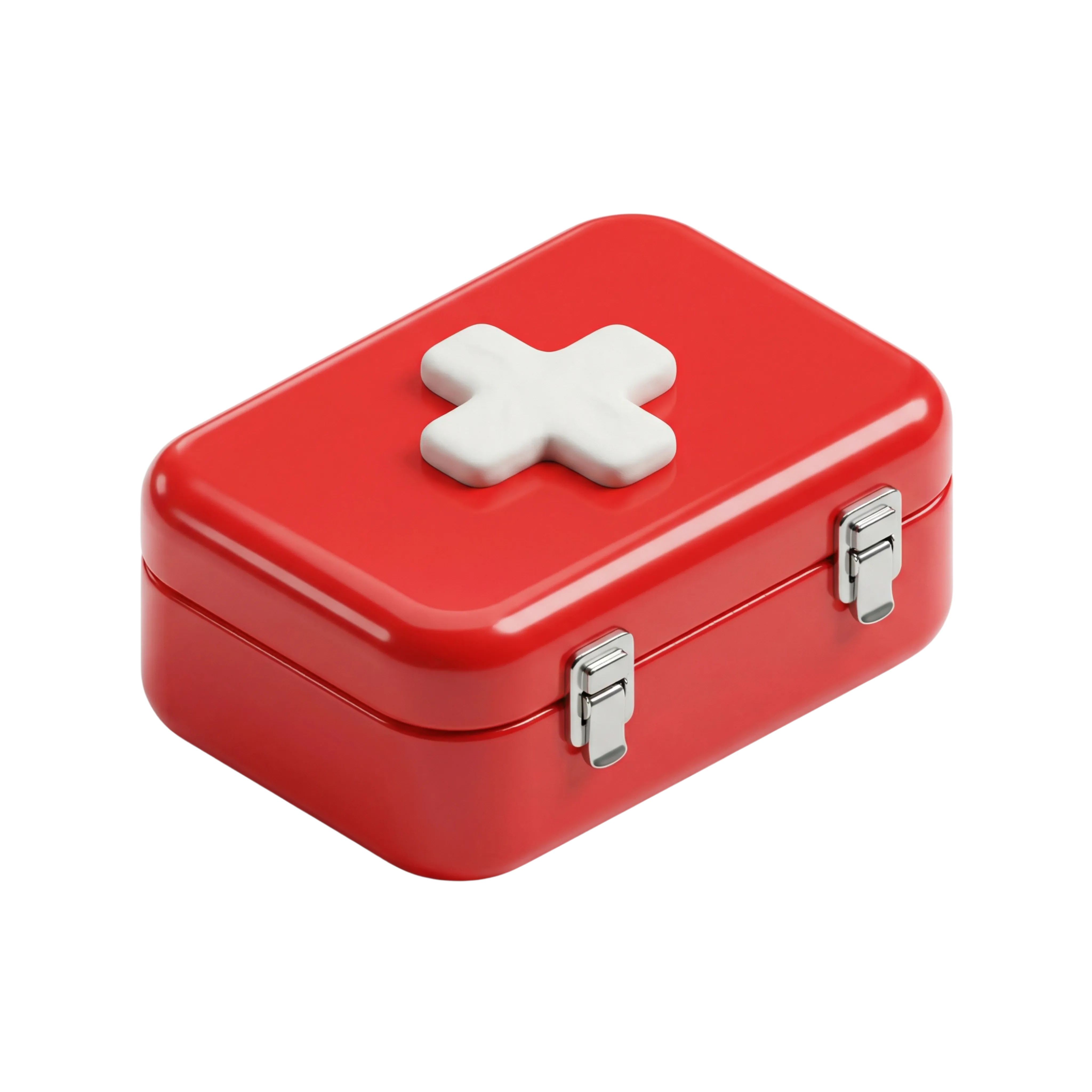 مجسم ثلاثي الأبعاد عالي الجودة لصندوق إسعافات أولية باللون الأحمر مع لمسة بلاستيكية لامعة، مزود بعلامة صليب أبيض بارزة وأقفال معدنية جانبية. مثالي لتطبيقات الصحة، تصاميم الطوارئ، والمشاهد التفاعلية ثلاثية الأبعاد.
