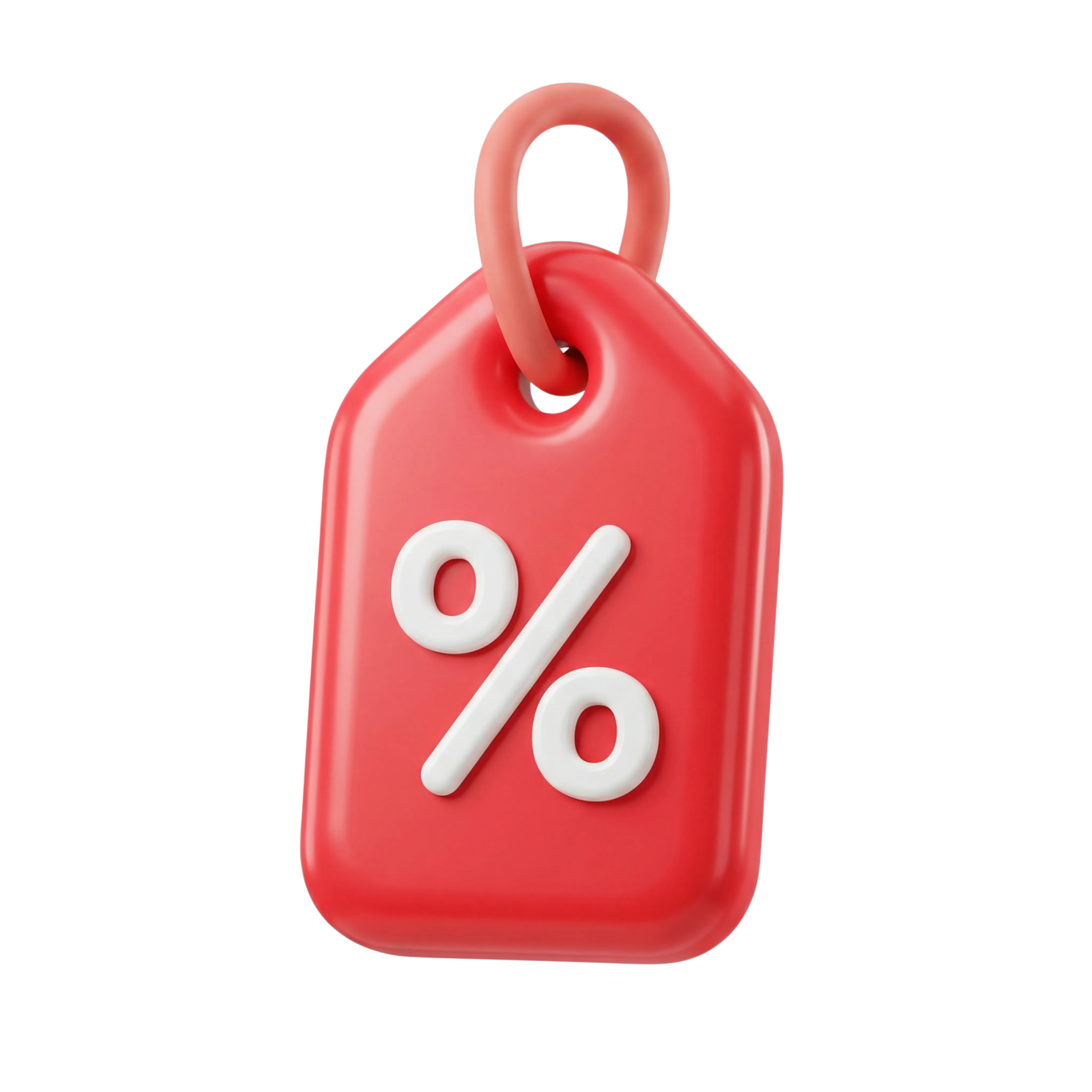 مجسم ثلاثي الأبعاد عالي الجودة لعلامة سعر حمراء زاهية بلمسة لامعة تشبه البلاستيك مع رمز النسبة المئوية باللون الأبيض. مثالية للاستخدام في التجارة الإلكترونية، لافتات الخصومات، تطبيقات التسوق، وتصاميم الواجهة الترويجية.