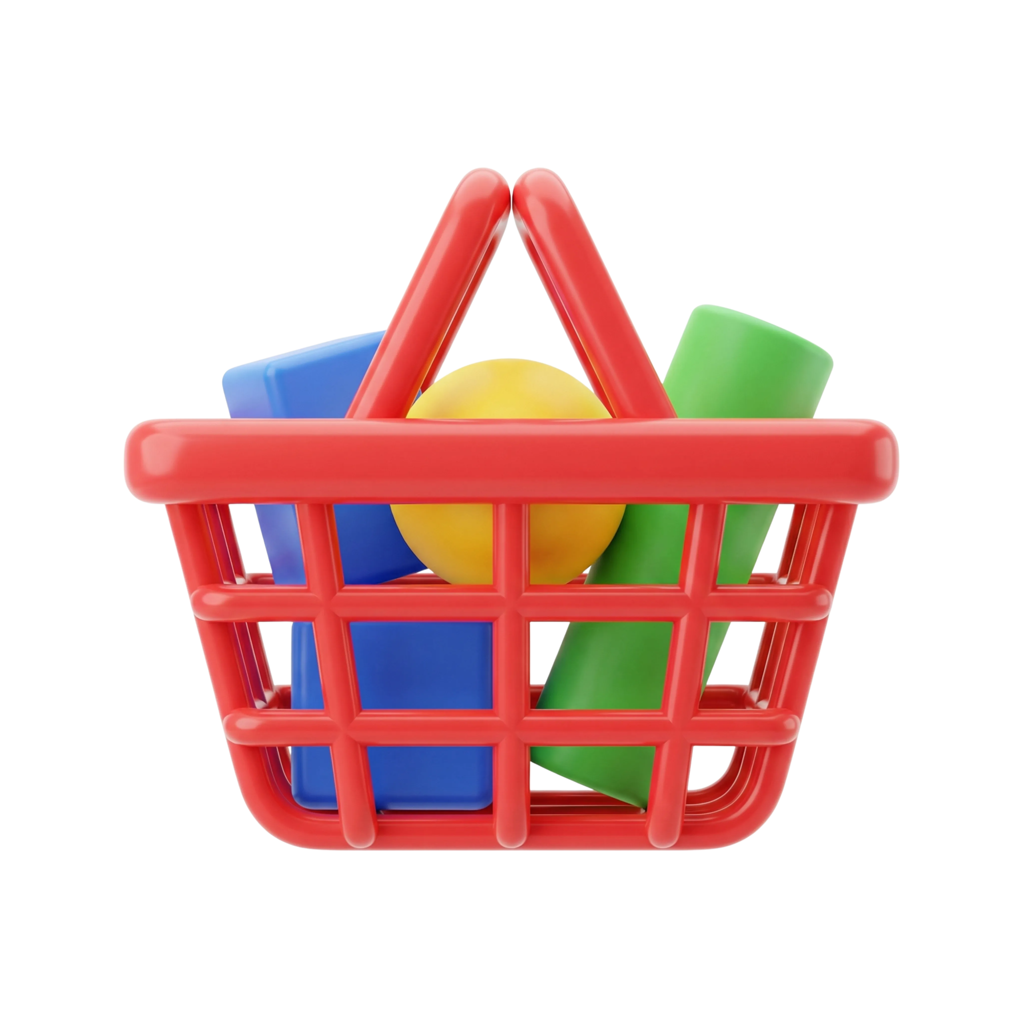 A vibrant 3D render of a red plastic shopping basket with a glossy finish, containing colorful geometric shapes. Ideal for e-commerce, retail, or mobile app UI design elements.