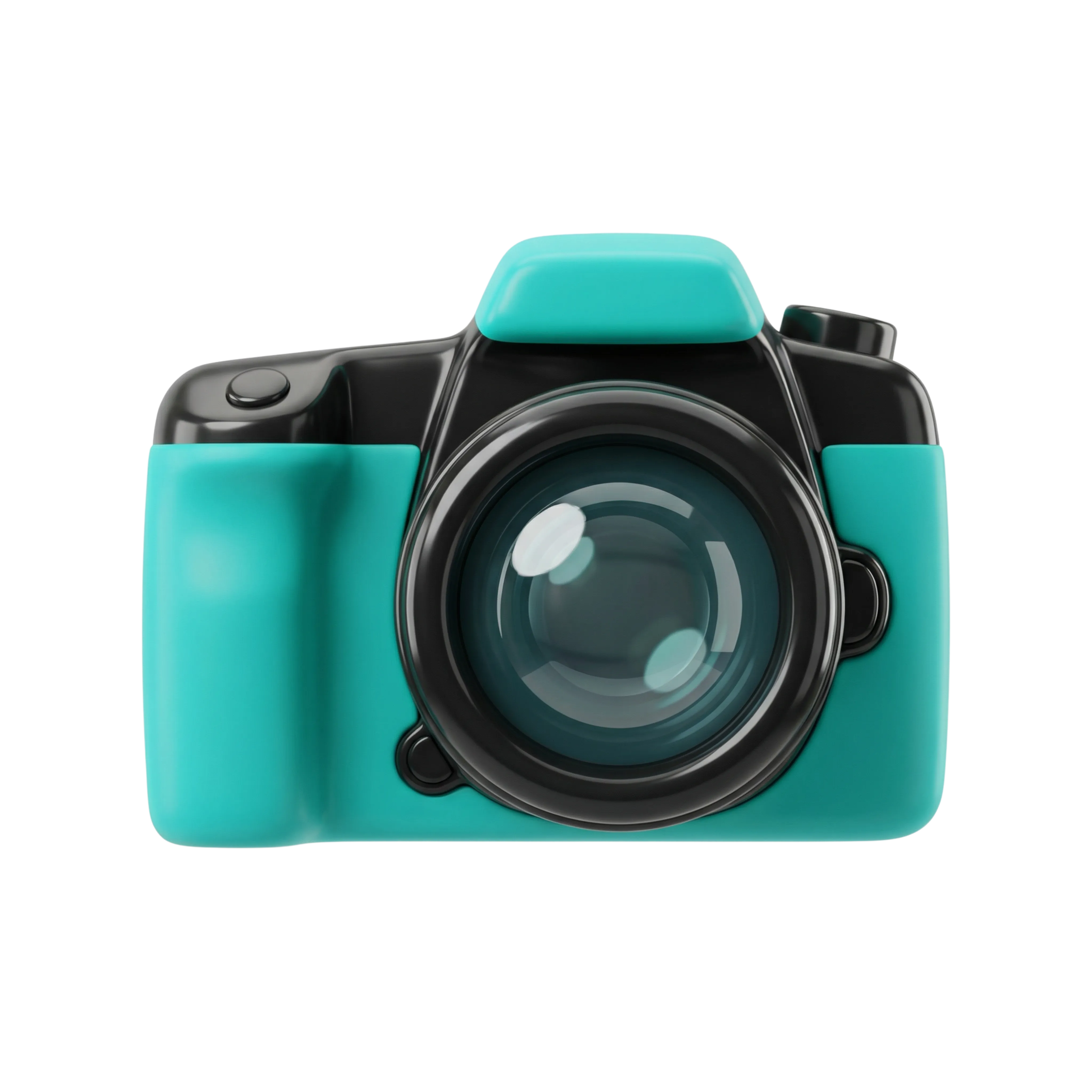 A high-quality 3D model of a DSLR camera icon featuring a glossy teal and black finish with a detailed lens element. Ideal for use in digital interfaces, photography apps, or creative media projects.