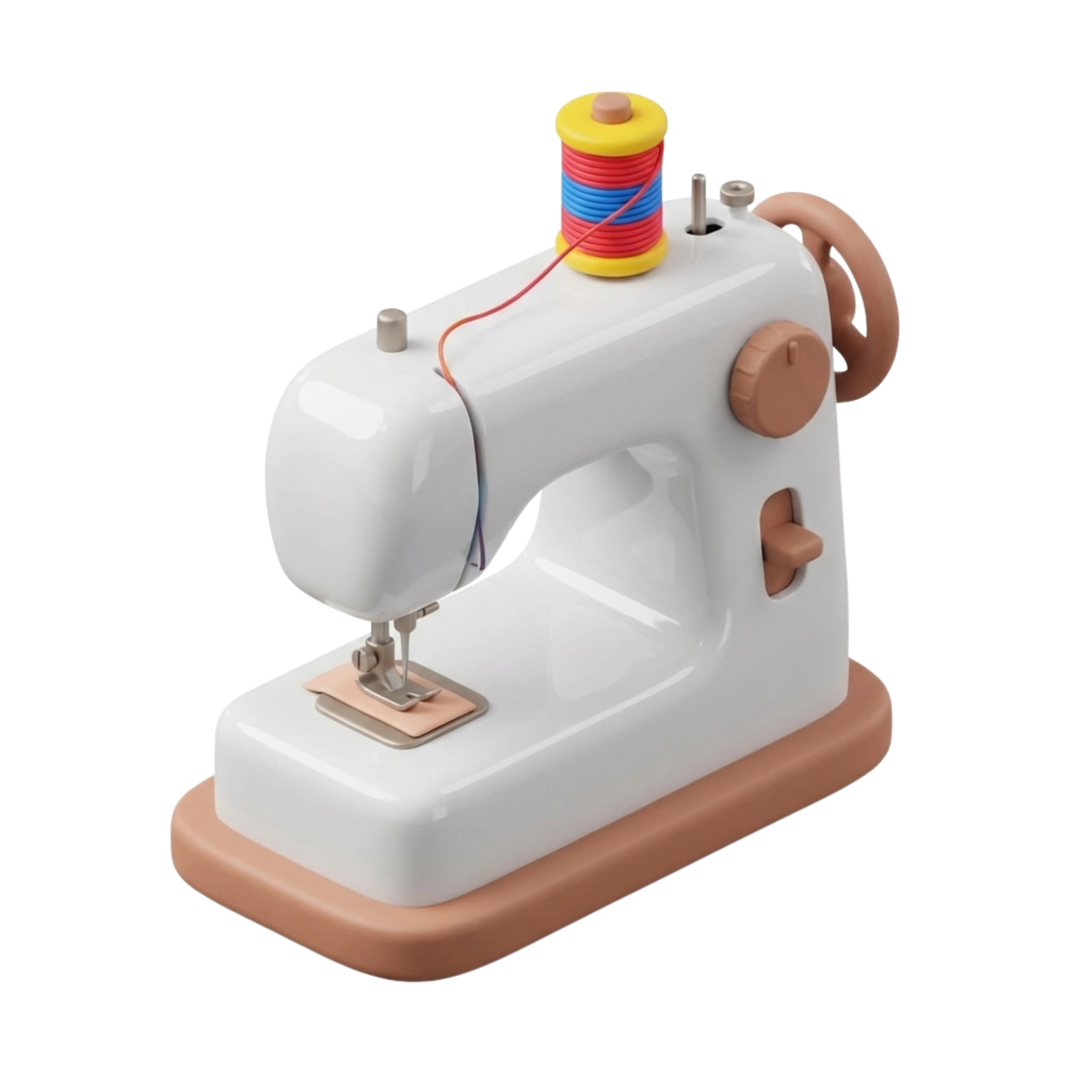 A high-quality 3D render of a modern sewing machine with a glossy white surface, peach controls, and a colorful thread spool. Ideal for fashion design scenes, educational content, and craft-related visual assets.