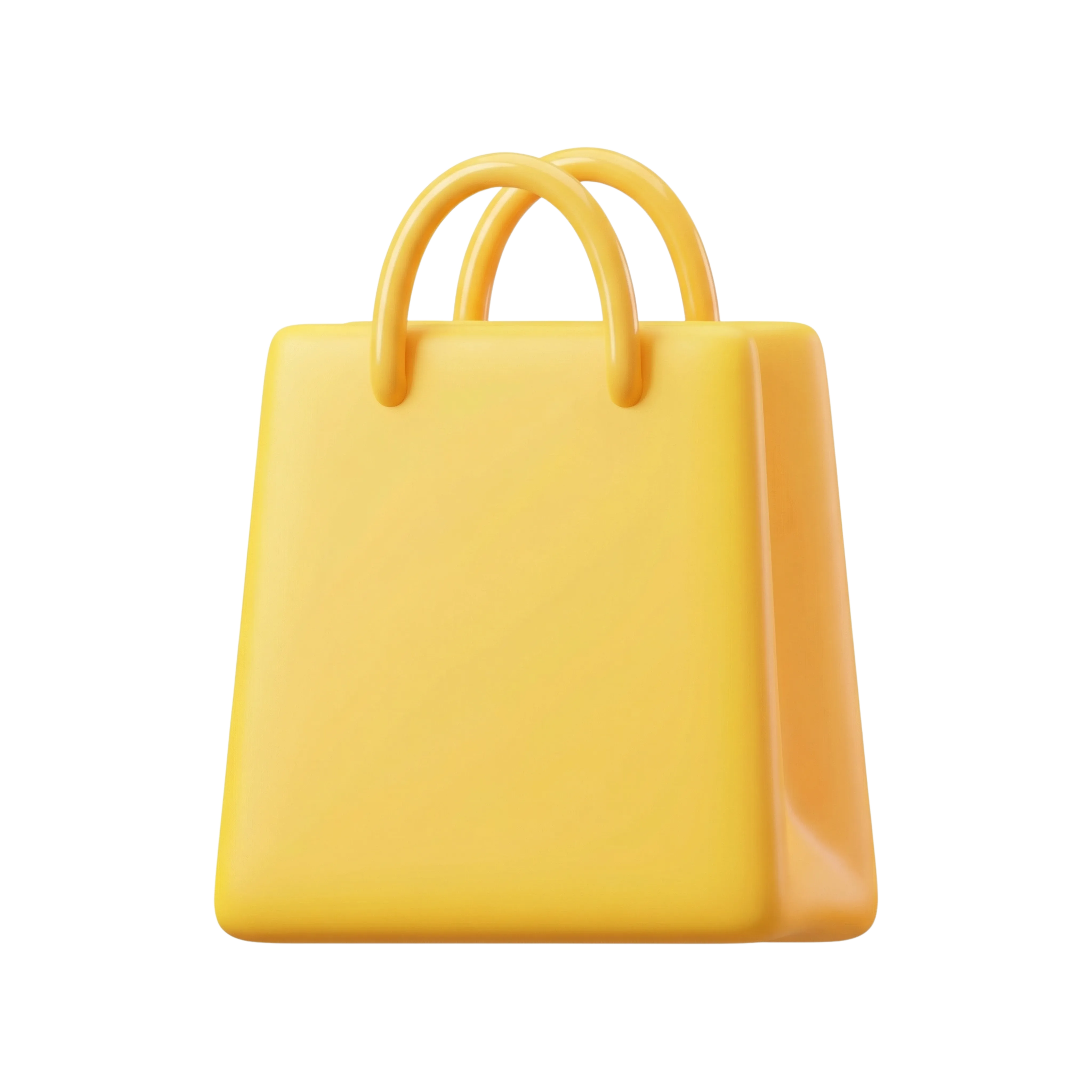 A high-quality 3D render of a shopping bag icon with a smooth, glossy yellow finish. Ideal for e-commerce platforms, user interfaces, retail app designs, and promotional visuals.