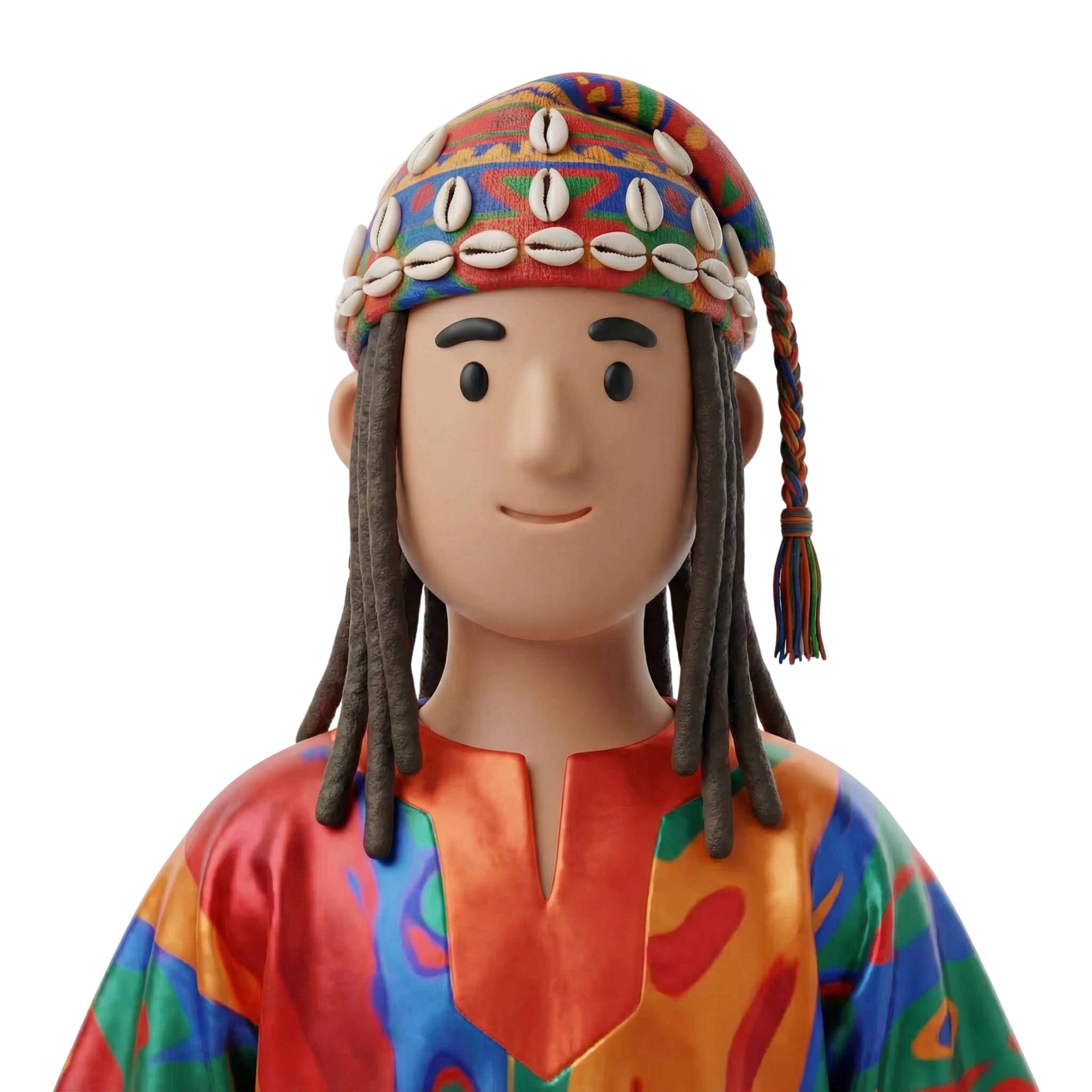 عازف ڭناوة مُبتهج يرتدي رداءً مغربياً ملوّناً وقبعة تقليدية مزينة بأصداف، يرمز إلى الفن الروحي والتراث المغاربي.
