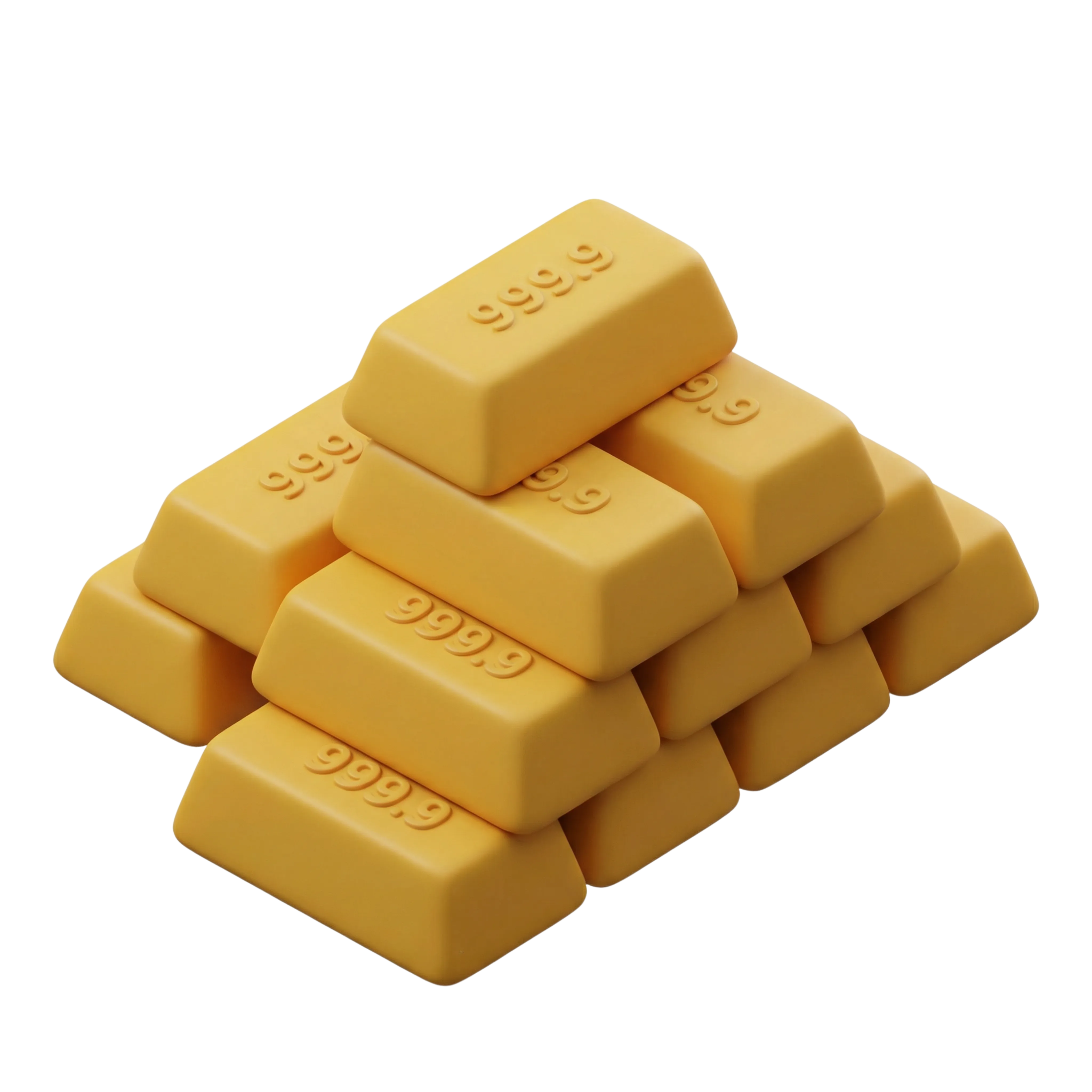 مجسم ثلاثي الأبعاد عصري لكومة من السبائك الذهبية بملمس مطفي وعلامة 999.9، مناسب لتطبيقات التمويل ولوحات بيانات الاستثمار والرسوم التوضيحية الاقتصادية.