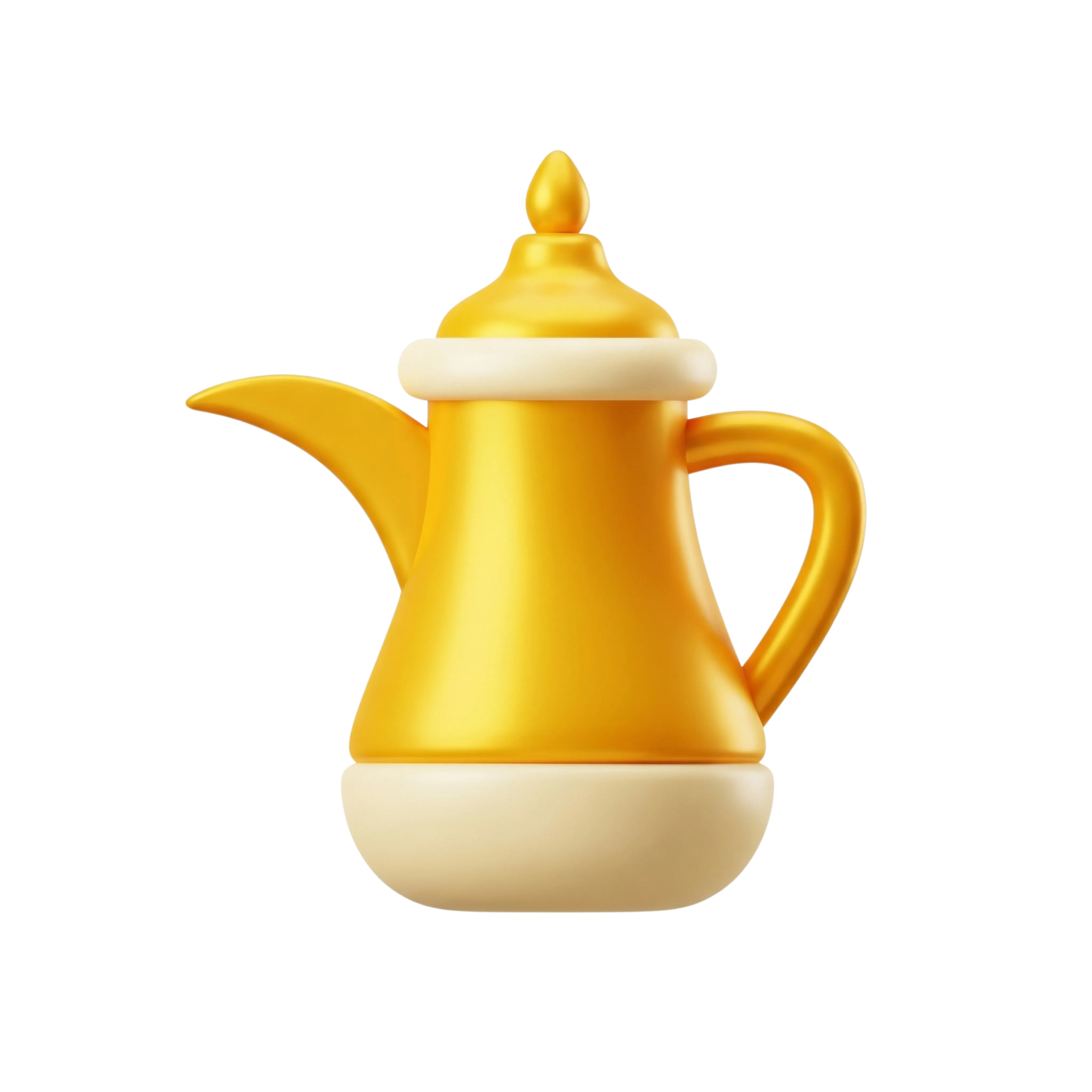 A stylized 3D render of a traditional Saudi dallah coffee pot with a smooth, glossy metallic gold surface and cream-colored borders. Ideal for cultural branding, hospitality UI icons, or regional visual content.