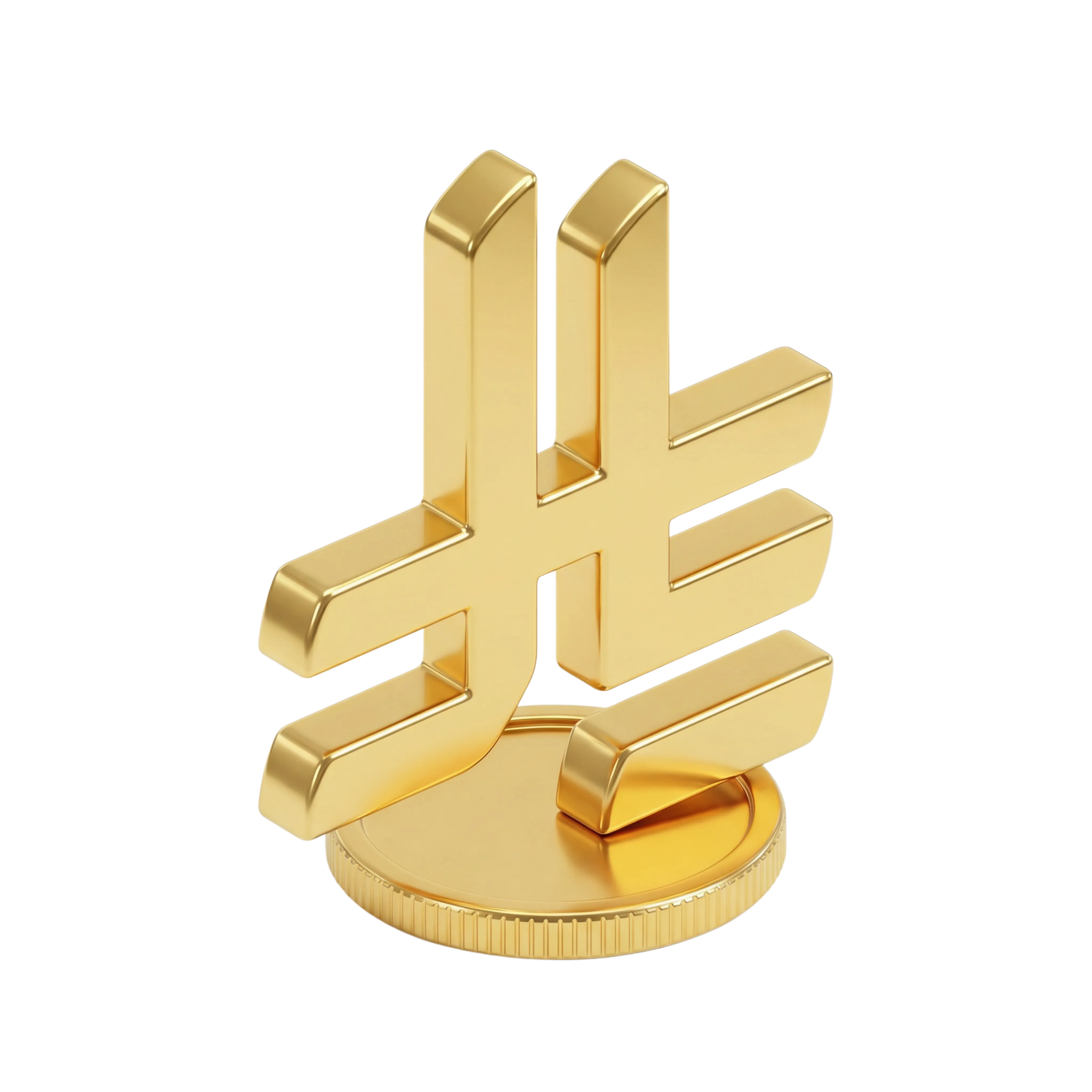مجسم ثلاثي الأبعاد عالي الجودة لرمز الريال السعودي بتشطيب معدني لامع باللون الذهبي، مثبت على قاعدة دائرية تمثل عملة معدنية. مناسب لتصاميم واجهات التطبيقات المالية والمصرفية أو الإنفوجرافيك المتعلقة بالعملات، ويعكس الهوية المالية للسعودية بشكل أنيق وفاخر.