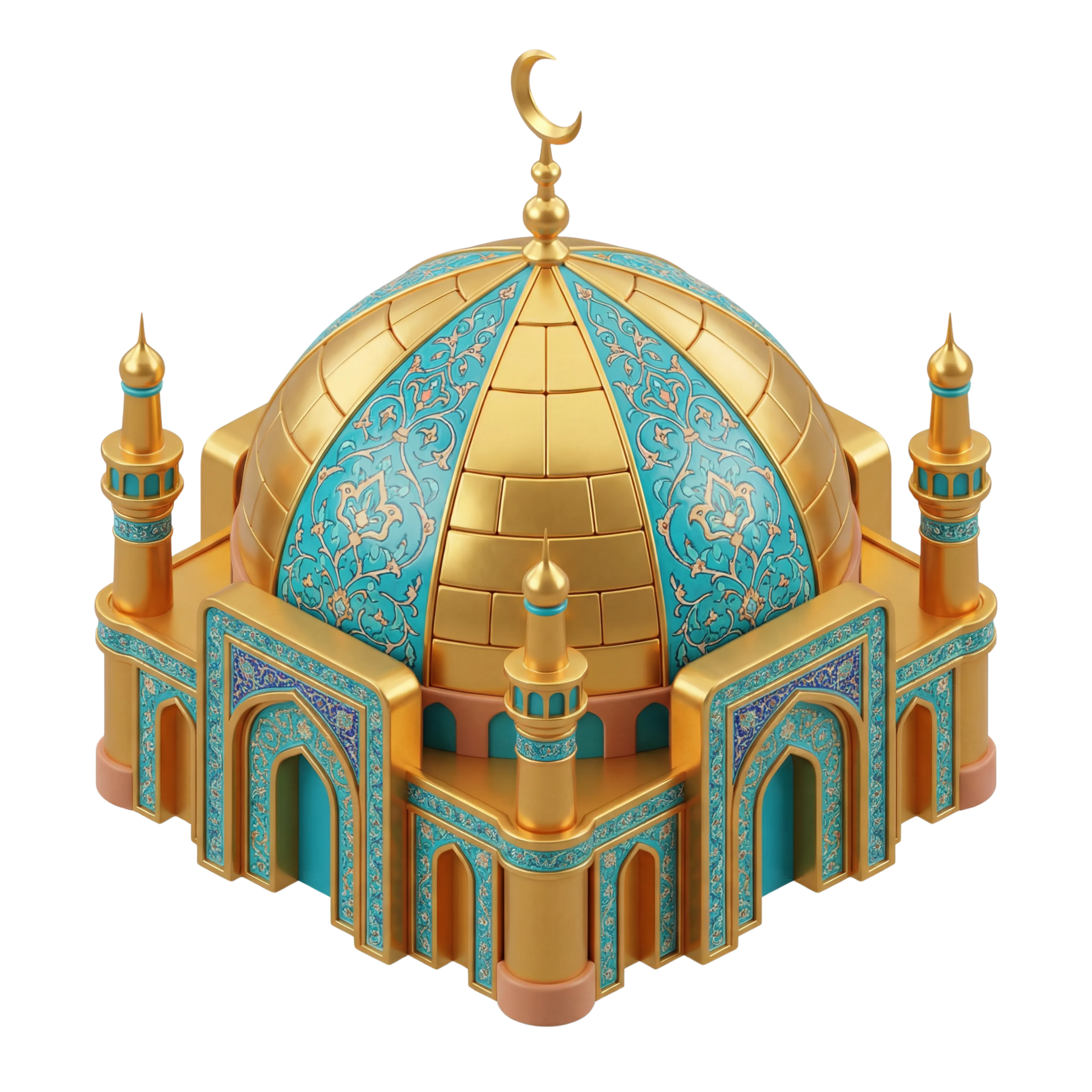 مجسم ثلاثي الأبعاد عالي الجودة لمزار إسلامي مزخرف يحتوي على قبة ذهبية لامعة مزينة بنقوش نباتية زرقاء وأربعة مآذن، مناسب للاستخدام في التصاميم الثقافية والمشاريع المعمارية والتطبيقات الدينية والمحتوى التاريخي.