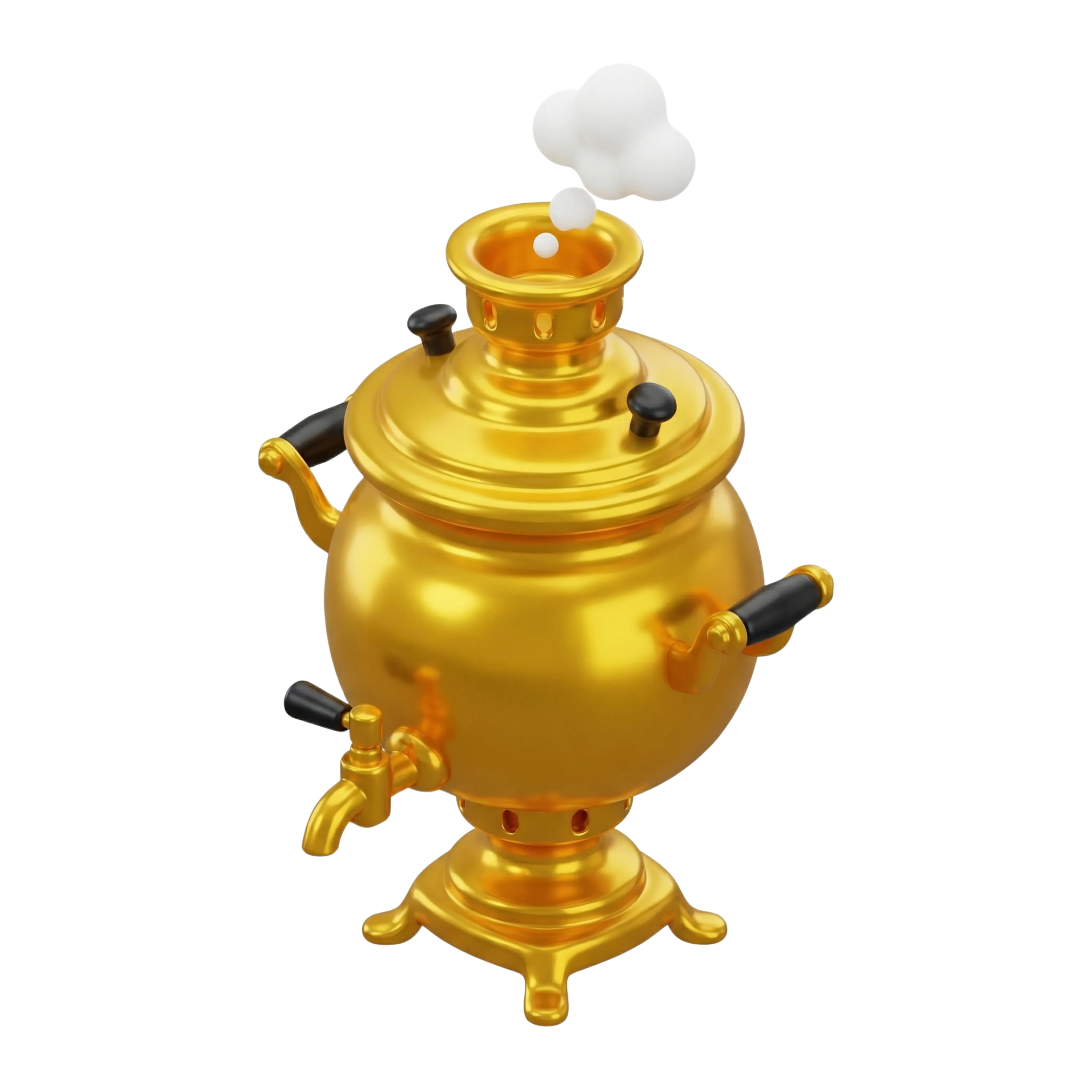 A high-quality 3D model of a traditional samovar made of glossy gold material, featuring black handles, detailed spout, and top steam vent. Commonly used for heating and serving tea, this decorative asset is ideal for digital scenes involving cultural storytelling, hospitality, or traditional kitchenware.
