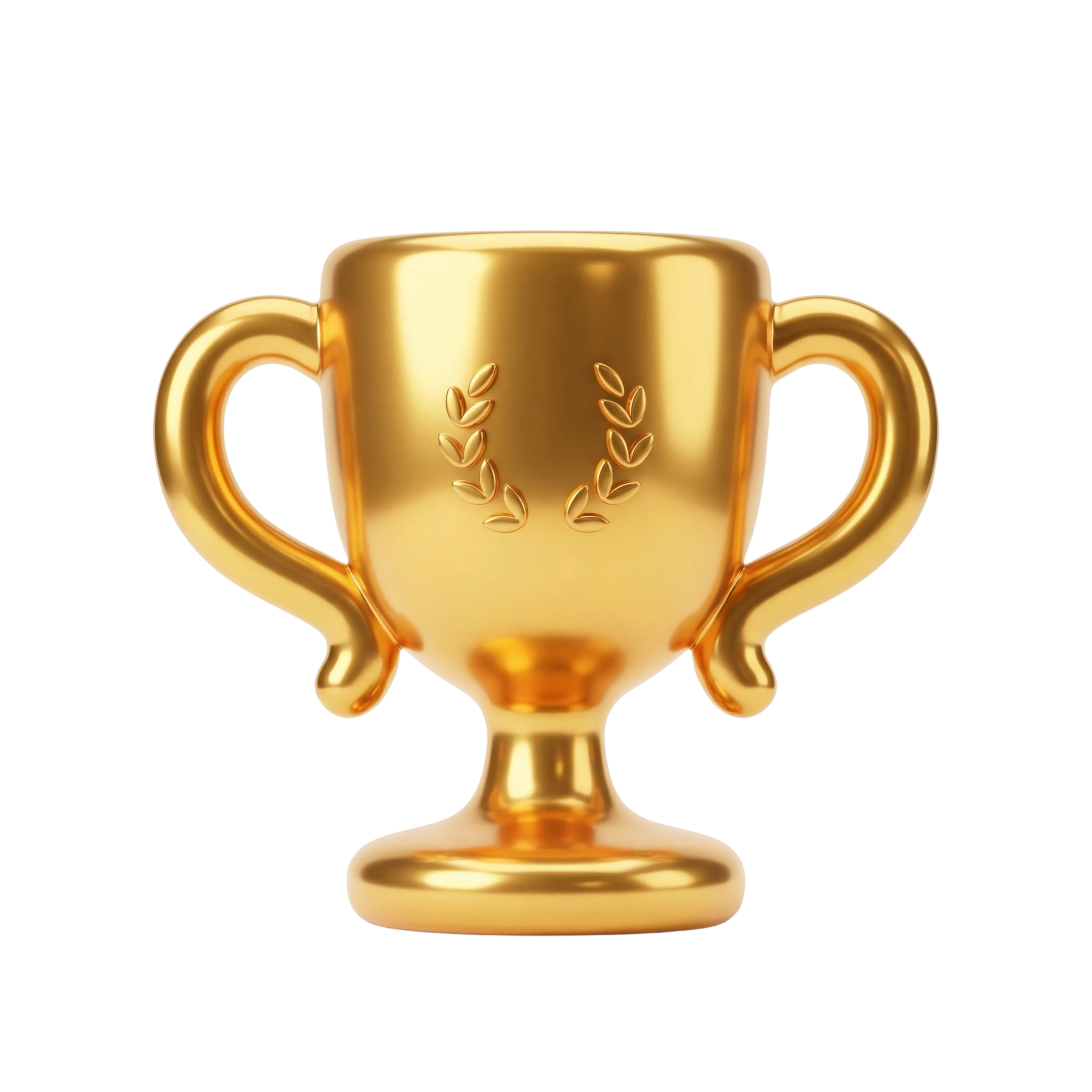 A high-resolution 3D render of a classic golden trophy cup with a laurel wreath emblem engraved on the front. The metallic, glossy finish enhances its realistic appearance, making it perfect for use in award graphics, UI elements, educational designs, or gamified achievement systems.
