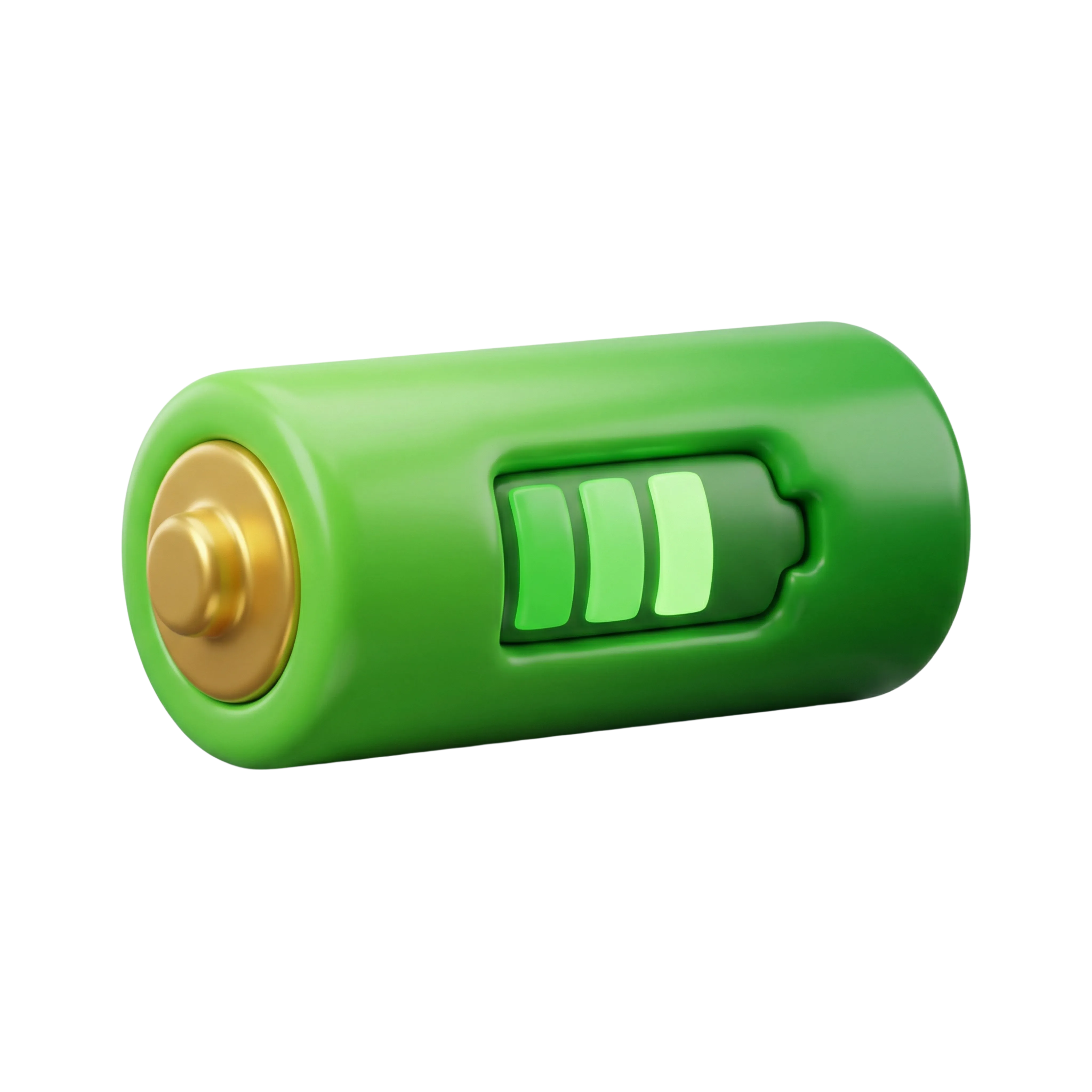 A high-quality 3D render of a green battery with a built-in glowing charge indicator, finished in a glossy texture. Ideal for use in mobile interfaces, energy-related infographics, and UI/UX design themes.