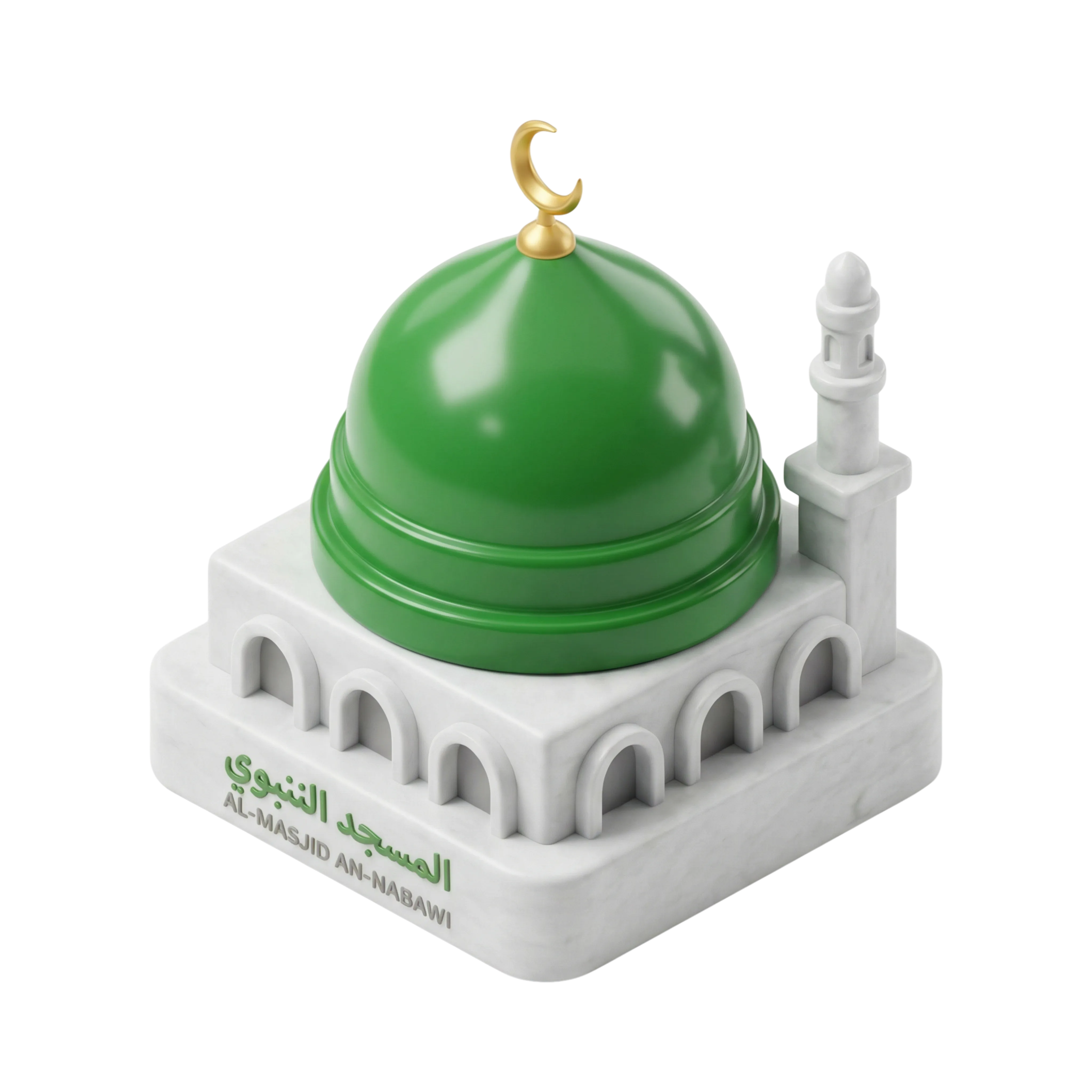 مجسم ثلاثي الأبعاد دقيق للقبة الخضراء الشهيرة في المسجد النبوي بالمدينة المنورة. يتميز بسطح أخضر لامع وهلال ذهبي في الأعلى، مستند على قاعدة مسجد بتصميم أبيض يشبه الرخام وبها تفاصيل أقواس ومنارة. مثالي للاستخدام في المشاريع البصرية الدينية أو الثقافية أو التعليمية.
