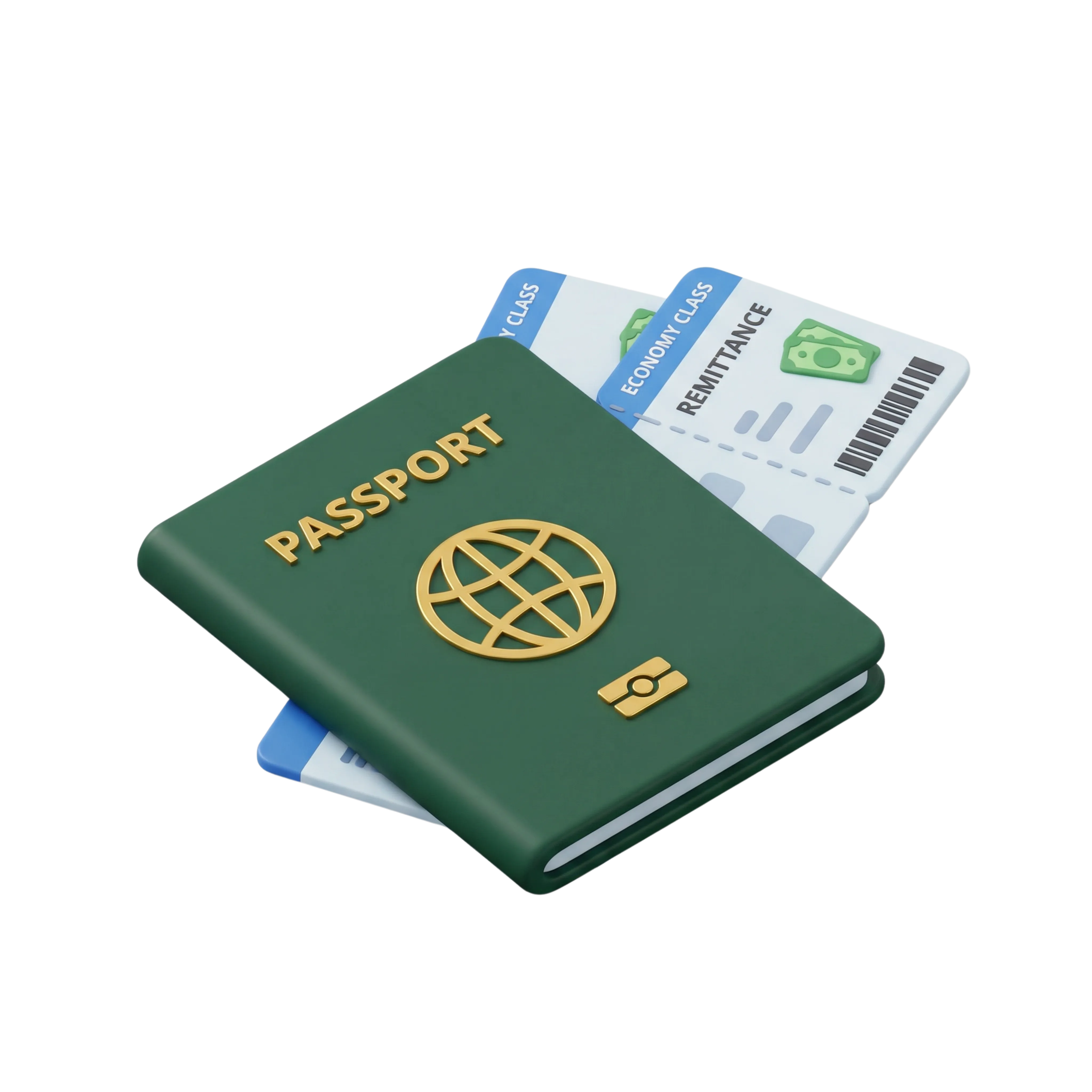 مجسم ثلاثي الأبعاد عالي الجودة لجواز سفر أخضر بملمس غير لامع وتفاصيل ذهبية بارزة، بجانبه تذكرتا سفر. مناسب لتصاميم واجهات المستخدم المتعلقة بالسفر والتأشيرات والهوية الدولية.