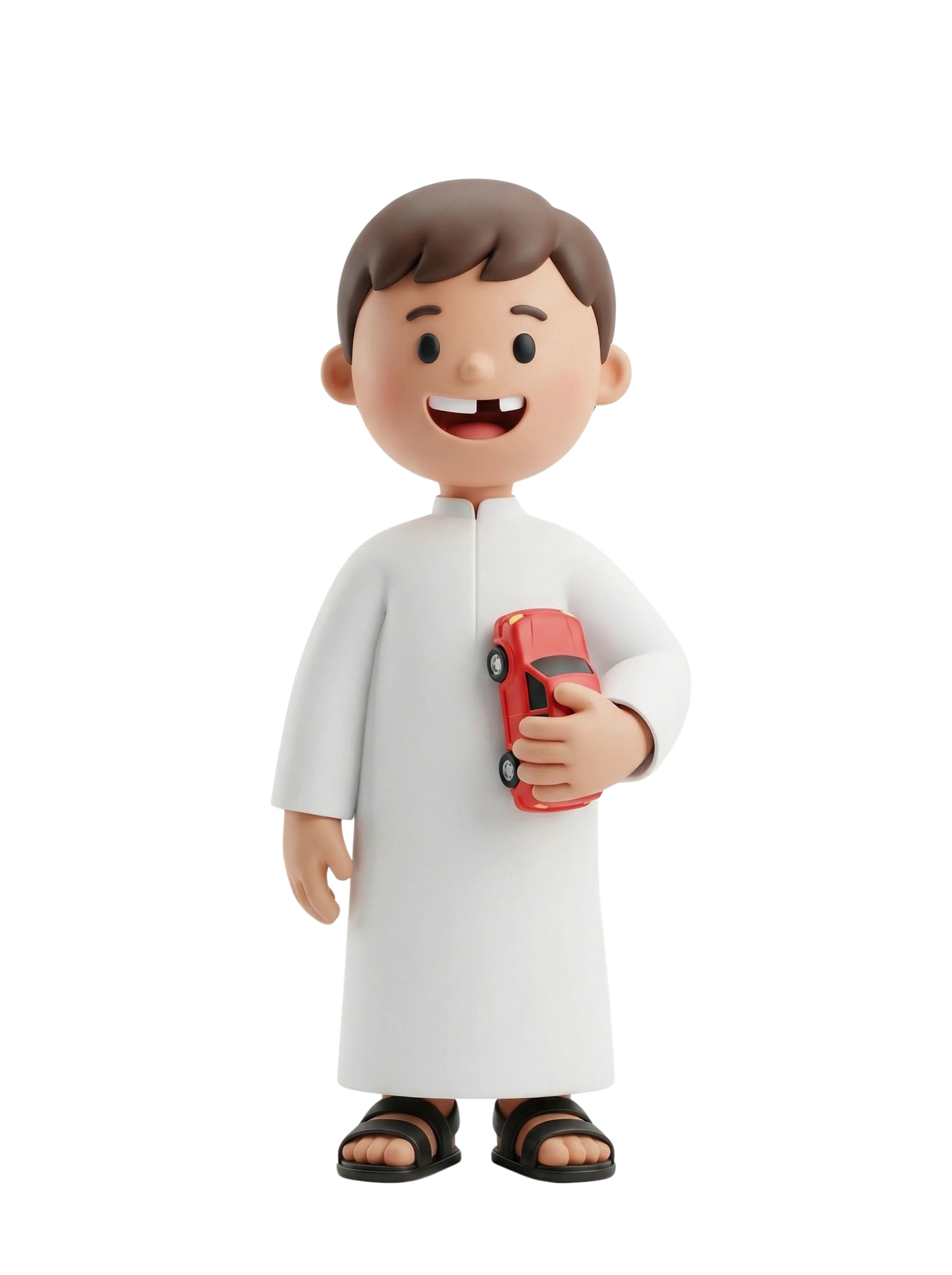 A cheerful Gulf boy dressed in a traditional white thobe and sandals, joyfully holding a red toy car, capturing the innocence and cultural charm of childhood in the Gulf region.