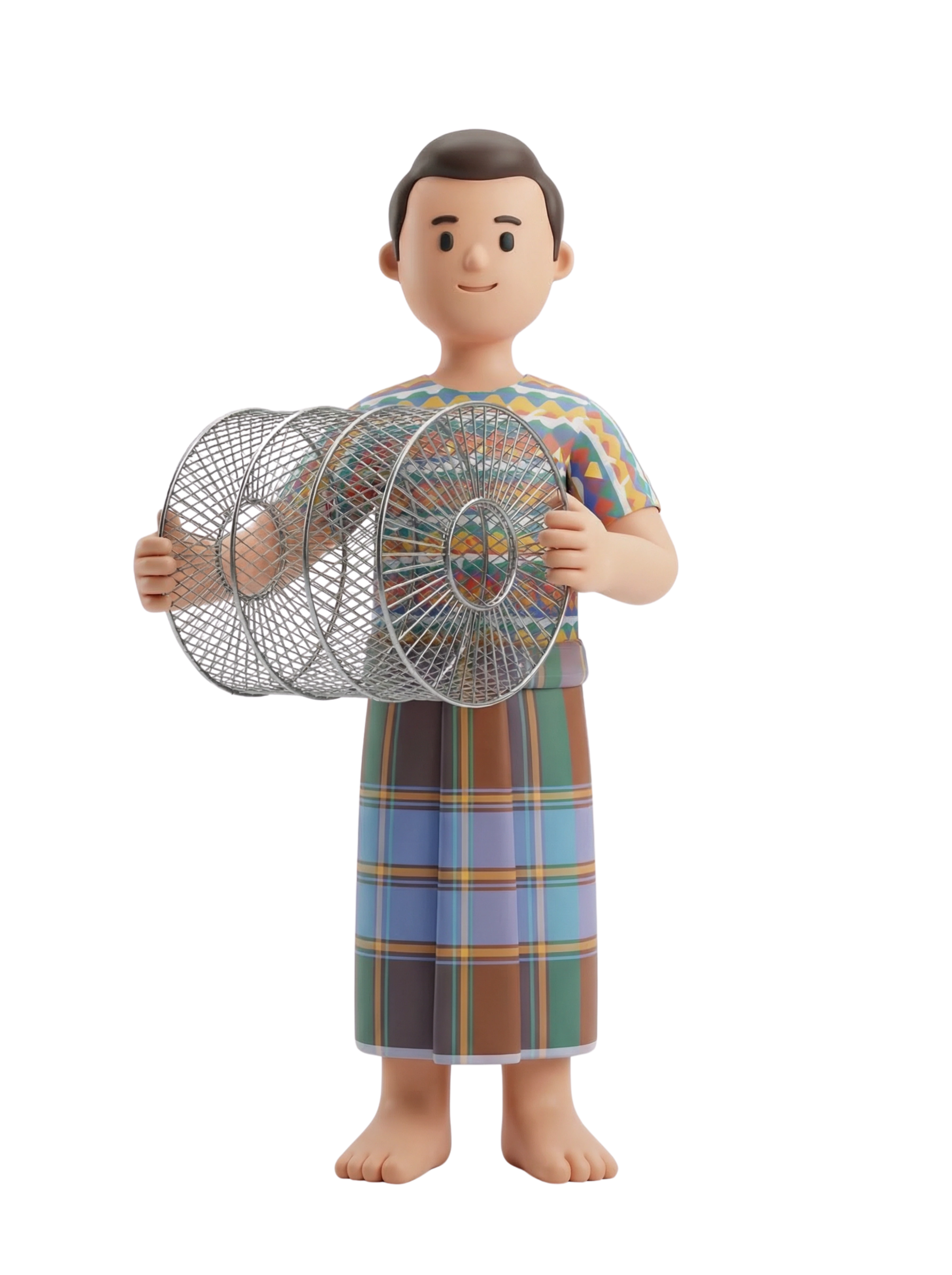 صياد خليجي تقليدي يقف بثقة حاملاً شباك صيد مصنوعة يدوياً من الأسلاك، معبّراً عن تراث المجتمعات الساحلية في منطقة الخليج العربي. زيه يعكس الملابس الملونة العملية التي يرتديها الصيادون في هذه المنطقة.