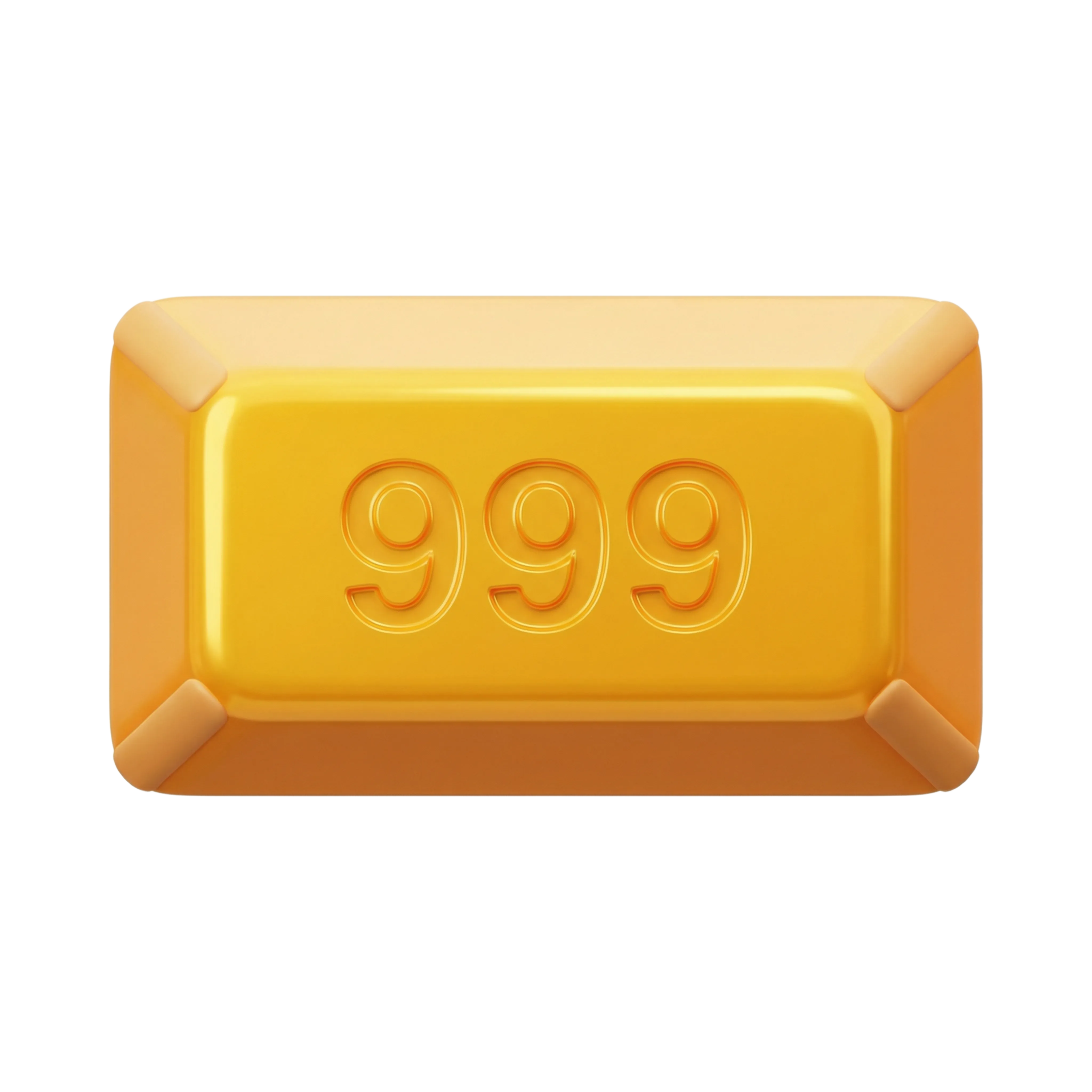 أيقونة ثلاثية الأبعاد مفصلة لشريط ذهب بخامة لامعة معدنية ونقش '999' للدلالة على النقاء العالي، مثالية لتطبيقات مالية، منصات استثمار، واجهات مستخدم أو تصاميم ذات طابع فاخر.