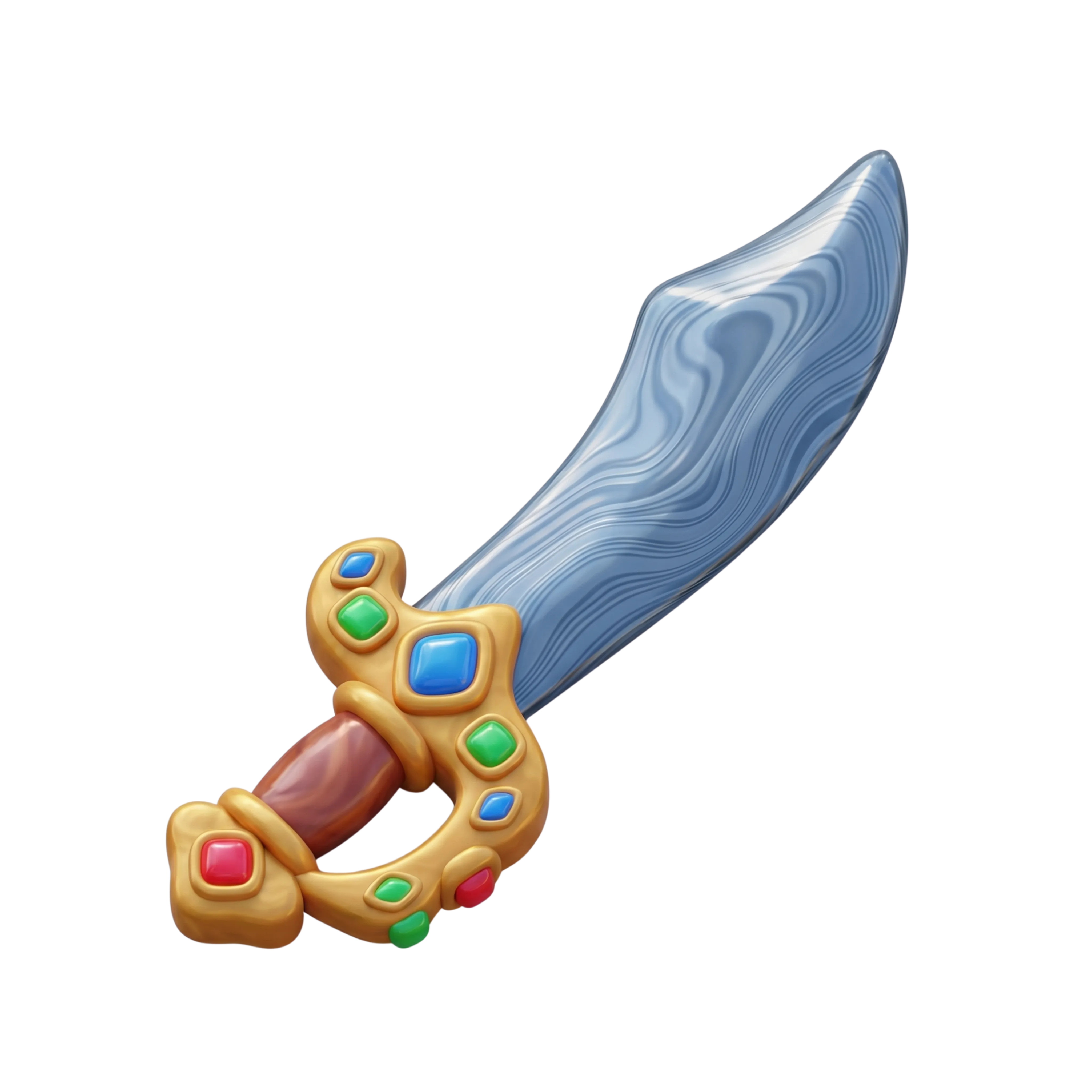 A high-resolution 3D model of a traditional Arabian-style dagger, featuring a curved metallic blade with a damascus-like pattern and an ornate gold hilt encrusted with colorful gemstones. Ideal for use in historical, fantasy, or Middle Eastern cultural scenes in games, animations, and virtual displays.