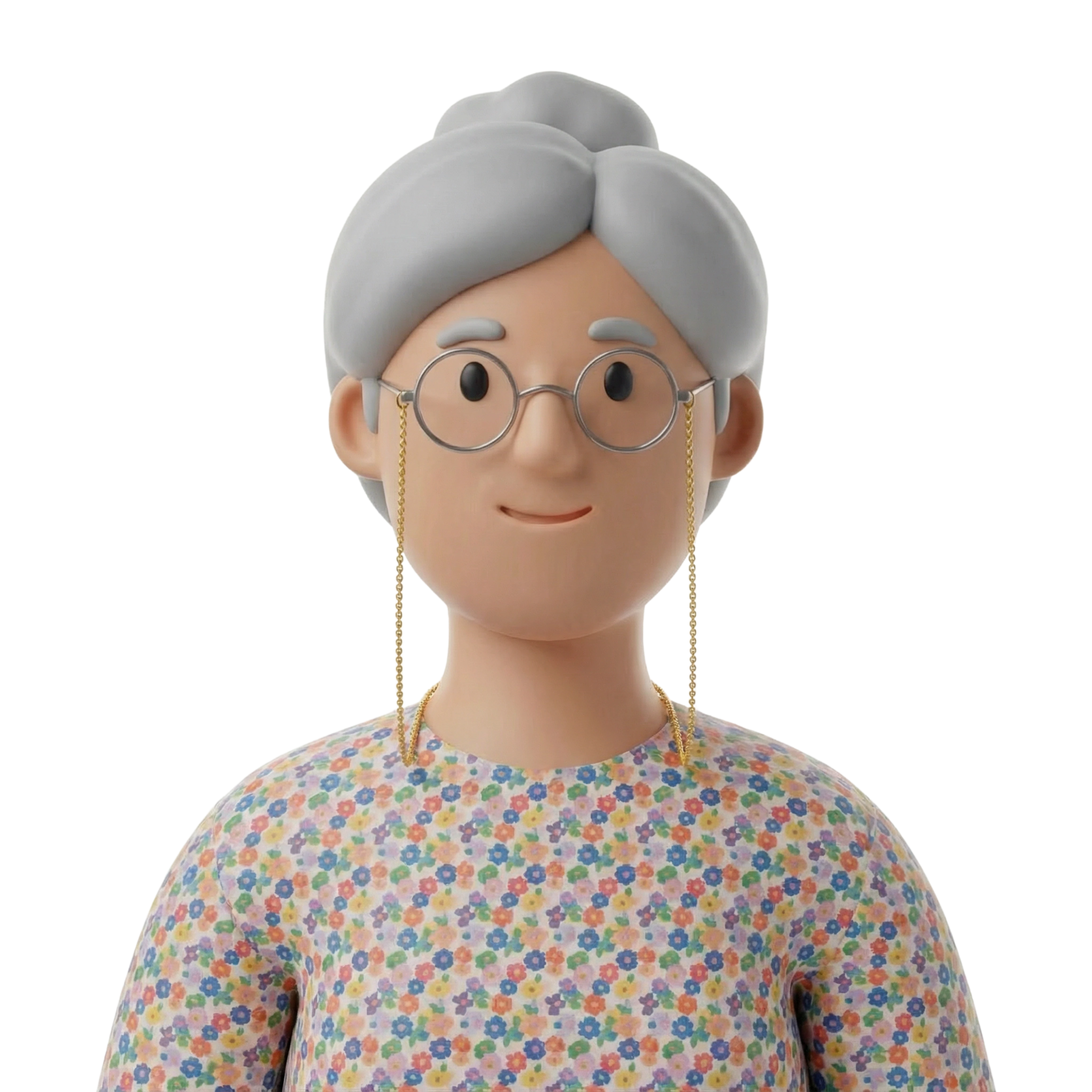جدة ودودة ترتدي فستانًا محتشمًا مزينًا بالأزهار، تجسد الحنان والحكمة المرتبطة بكبار السن في الأسرة.