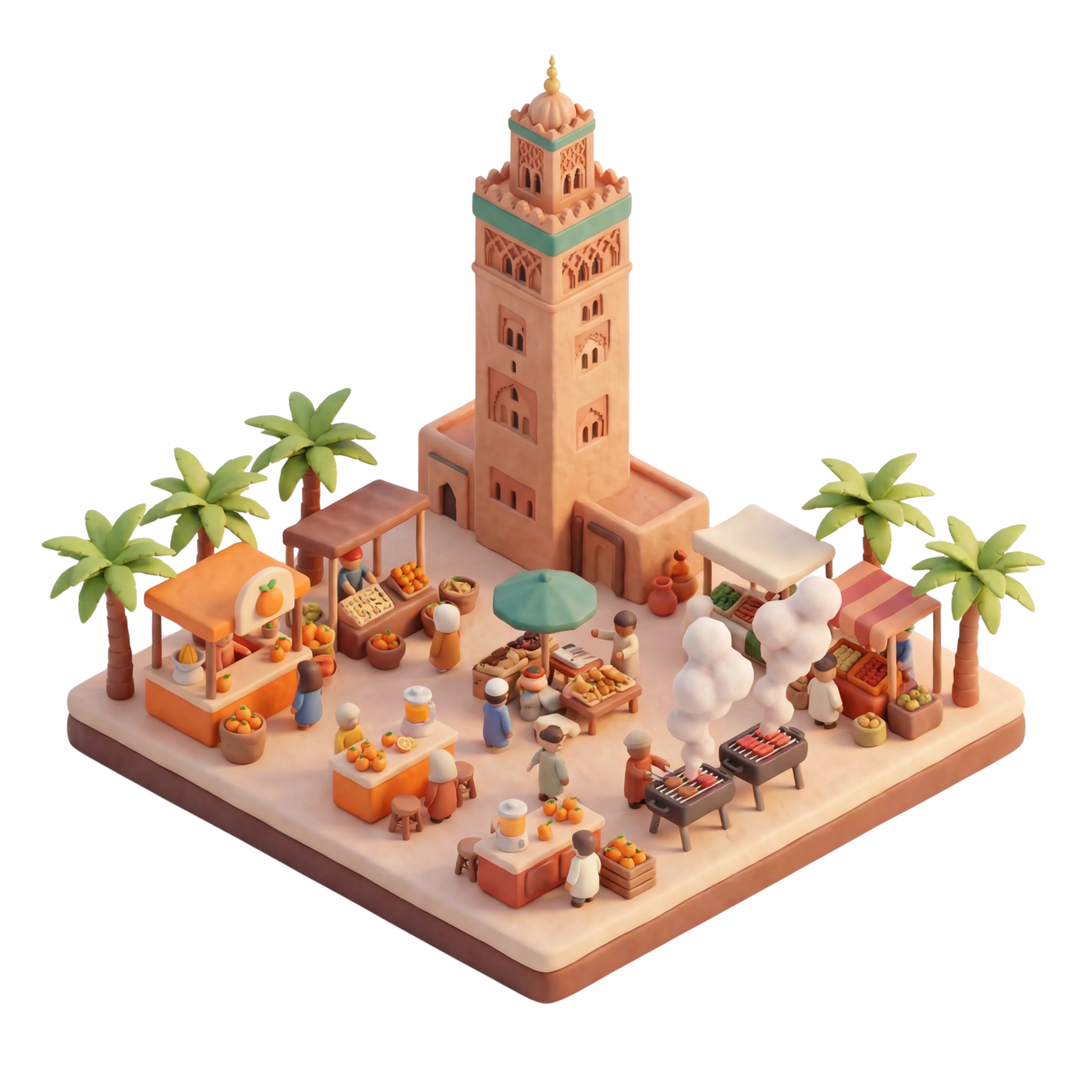 Rising gracefully over the medina of Marrakech, the Koutoubia Mosque is a masterpiece of Almohad architecture dating back to the 12th century. Its majestic sandstone minaret, adorned with intricate arches and green ceramic trim, towers above a bustling square filled with vendors, echoing centuries of Islamic tradition, communal life, and spiritual prominence in Morocco.