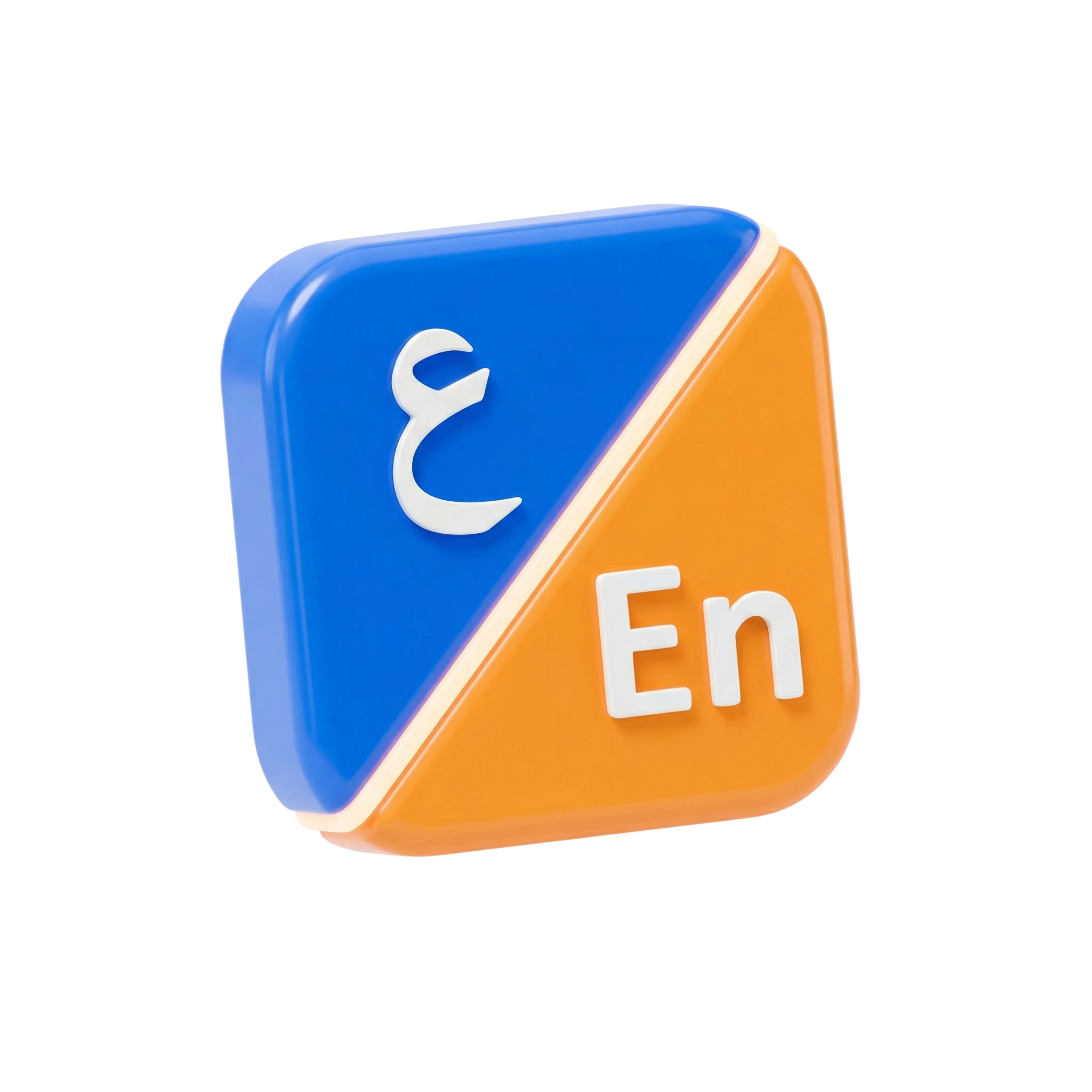 A high-resolution 3D icon representing a language switch button with Arabic and English letters. The object features a glossy finish with a diagonally split orange and blue tile, making it ideal for use in UI/UX design, mobile applications, and websites requiring bilingual or multilingual support.
