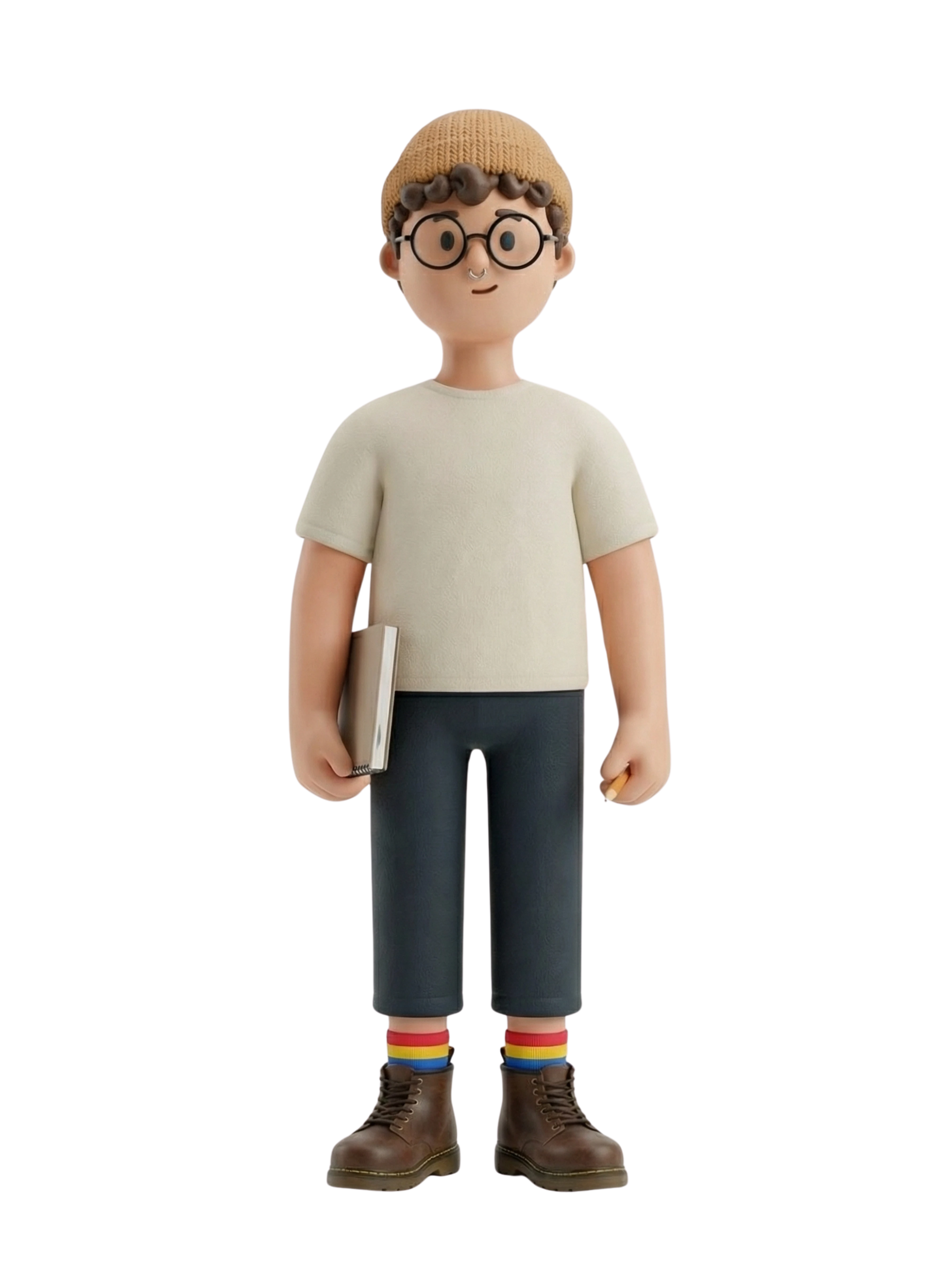 A creative Lebanese art student confidently carrying a sketchbook, dressed in expressive casual fashion that reflects an artistic and youthful spirit.