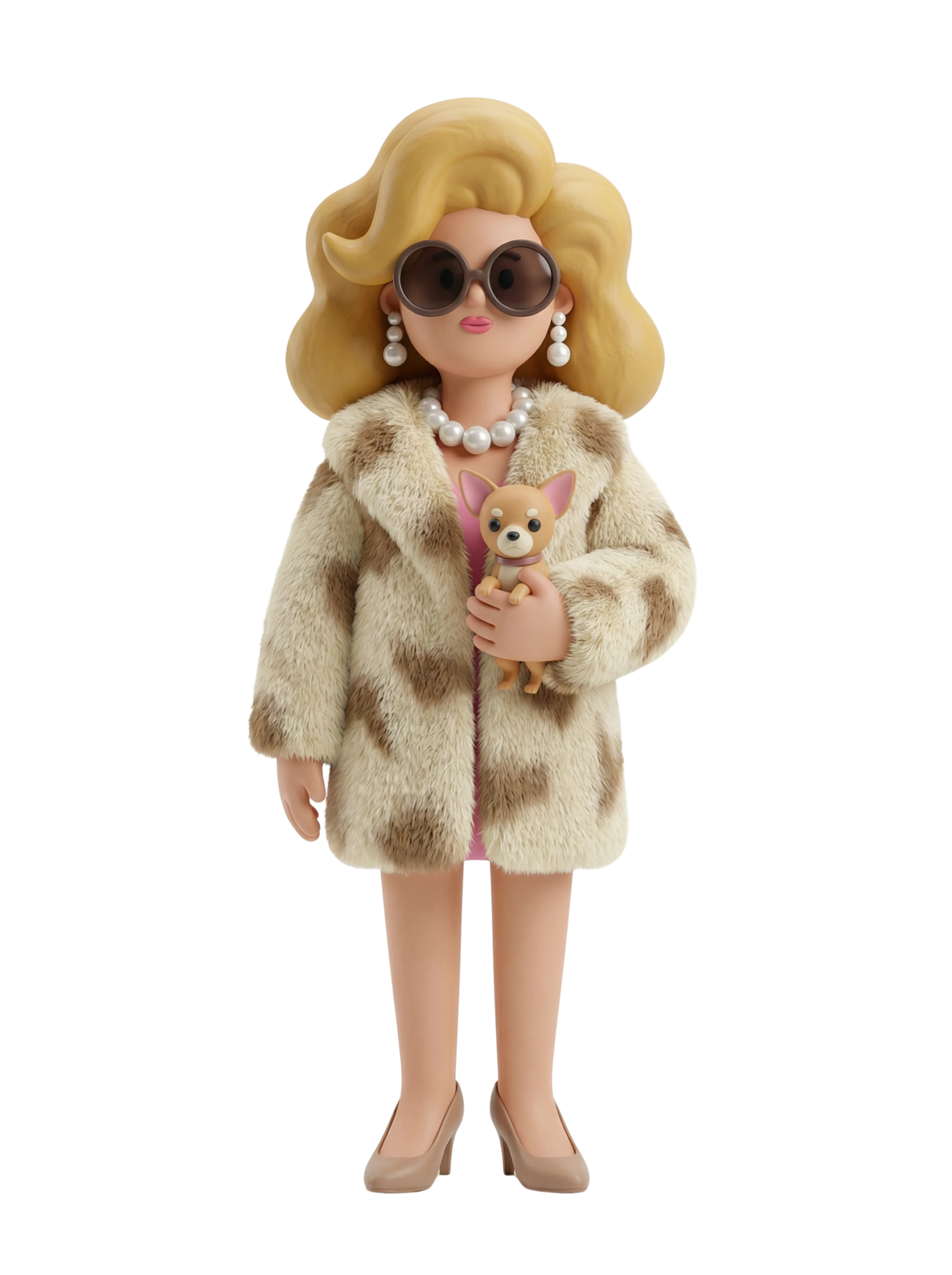 خالة لبنانية أرستقراطية تنضح بسحر الزمن الجميل، ترتدي معطفاً فاخراً من الفرو الصناعي، وقلادة لؤلؤية بارزة، وتحمل كلباً صغيراً تعكس من خلاله أناقة بيروت الراقية وروحها الاجتماعية.