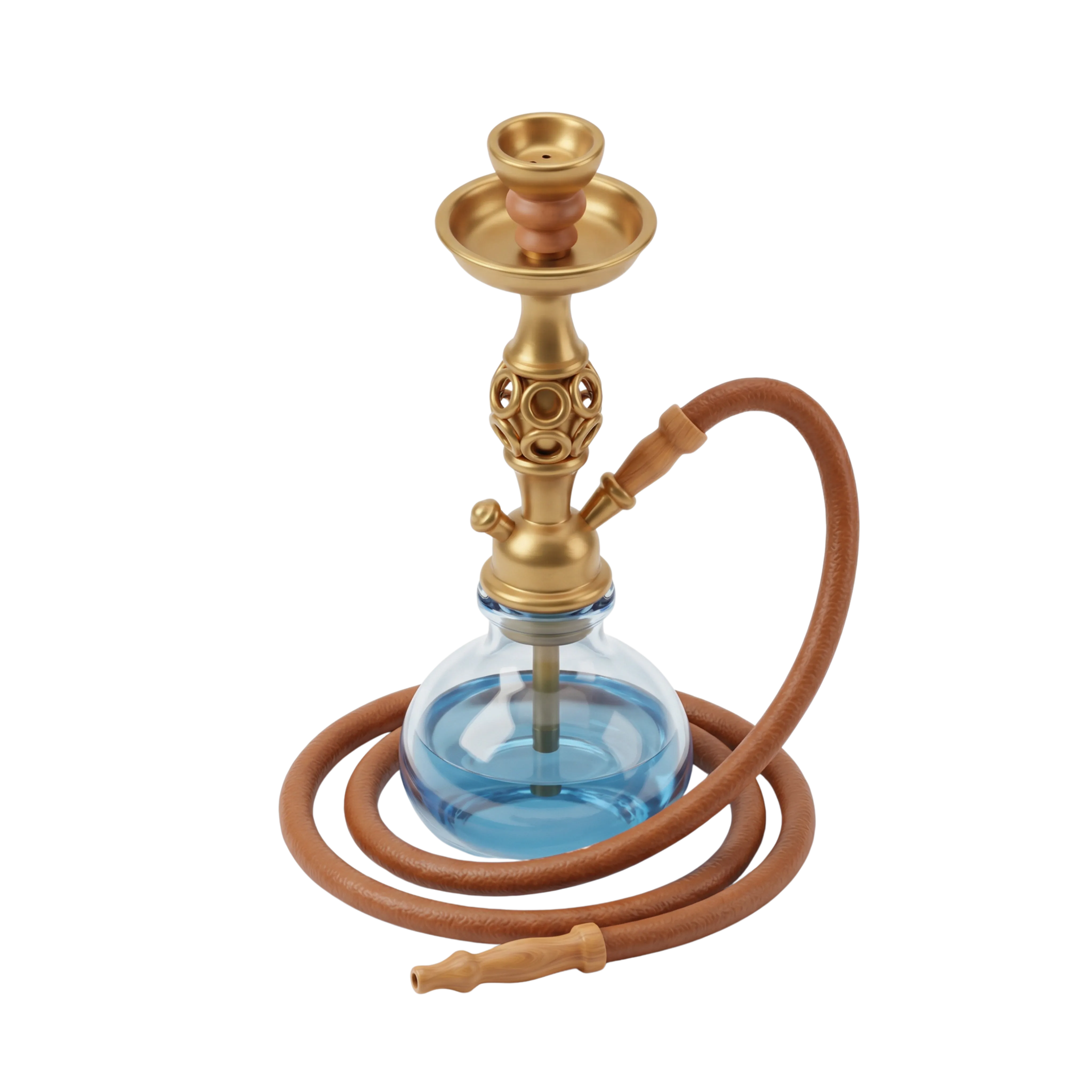 A detailed 3D render of a traditional Levantine hookah, featuring a glossy metallic brass stem, transparent glass base filled with blue water, and a curved brown hose. Ideal for cultural visualizations, hospitality themes, and Middle Eastern decor elements.