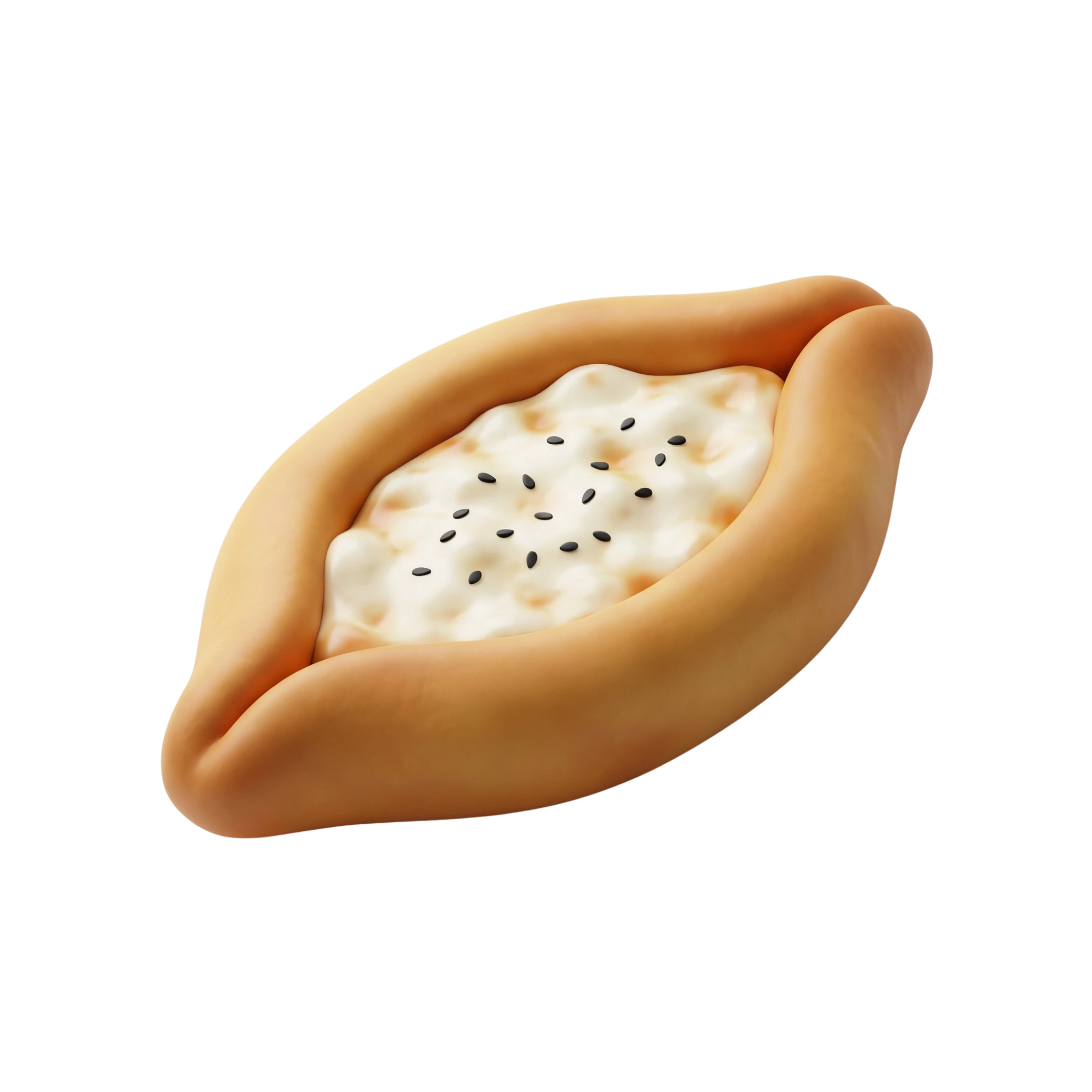 A soft boat-shaped pastry stuffed with tangy white cheese, often Akkawi or Nabulsi, and lightly seasoned with herbs or black sesame. The crust is golden and tender while the filling is creamy, salty, and melts in your mouth, making each bite rich and satisfying.