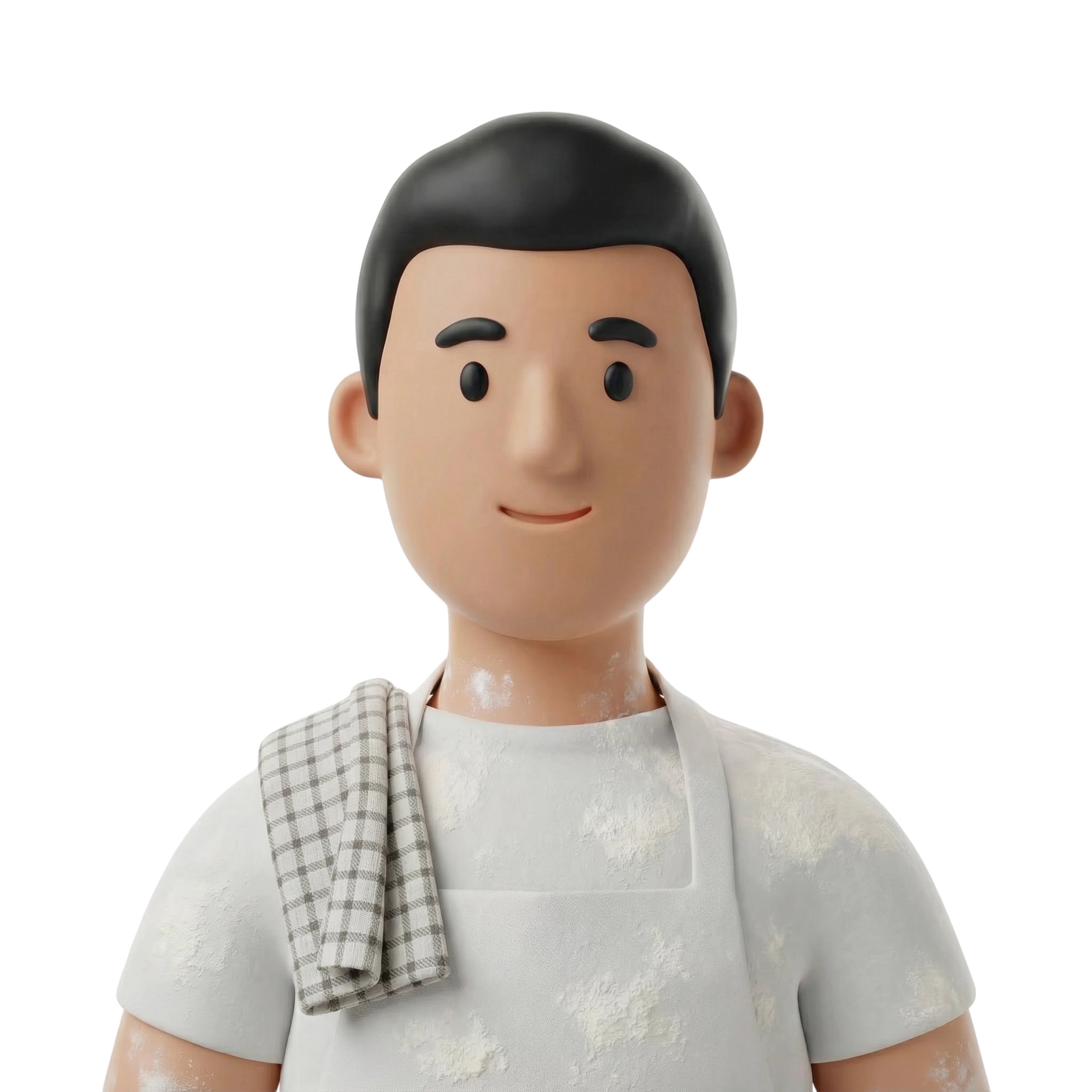 A cheerful Levantine baker prepares traditional manakish, wearing a flour-dusted white apron and a checkered towel draped over his shoulder, embodying the warmth of regional street food culture.