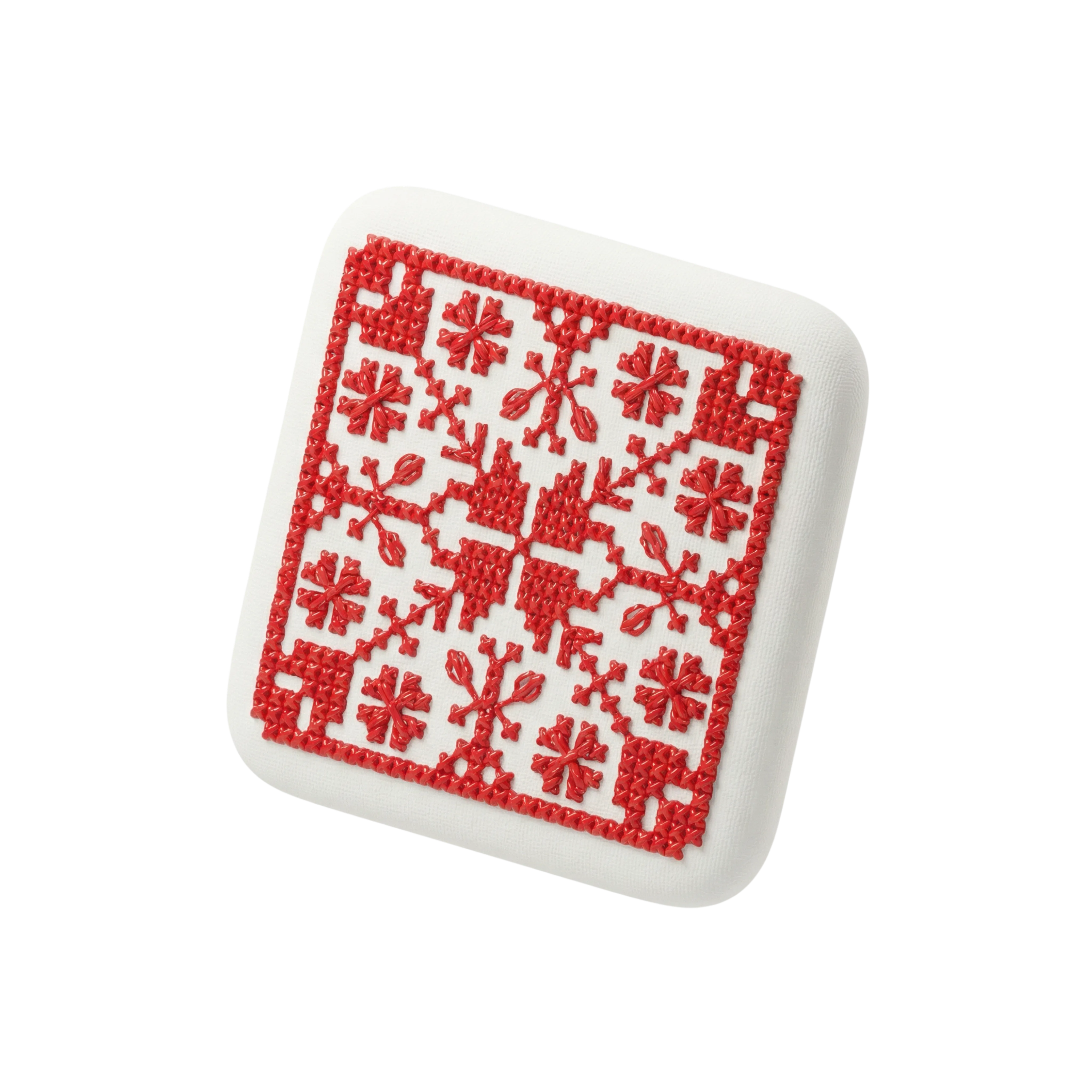 مجسم ثلاثي الأبعاد عالي الجودة لوسادة تحتوي على تطريز فلسطيني تقليدي بلون أحمر لامع مرفوع على سطح ناعم غير لامع. مثالي للاستخدام في المشاريع الرقمية ذات الطابع التراثي، واجهات الرسوميات، وتصميم الأيقونات.