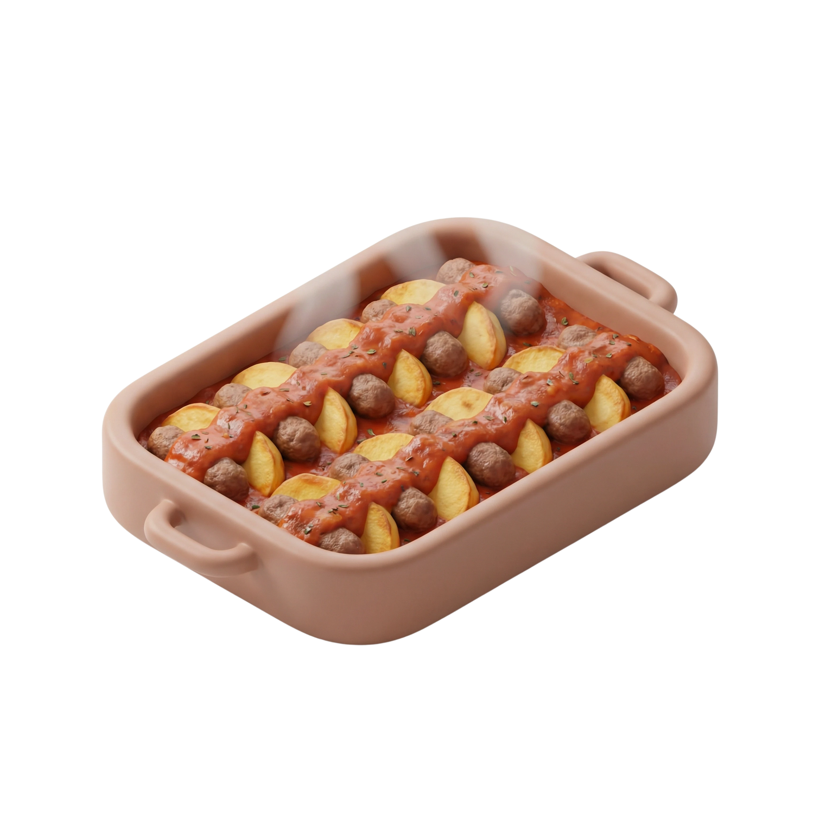 كرات الكفتة الشهية وشرائح البطاطس المحمرة تُشوى بالفرن في صلصة طماطم غنية وعطرية. مزيج دافئ من اللحم المتبل الطري والبطاطس المشوية التي تمتص نكهات الصلصة الشهية.