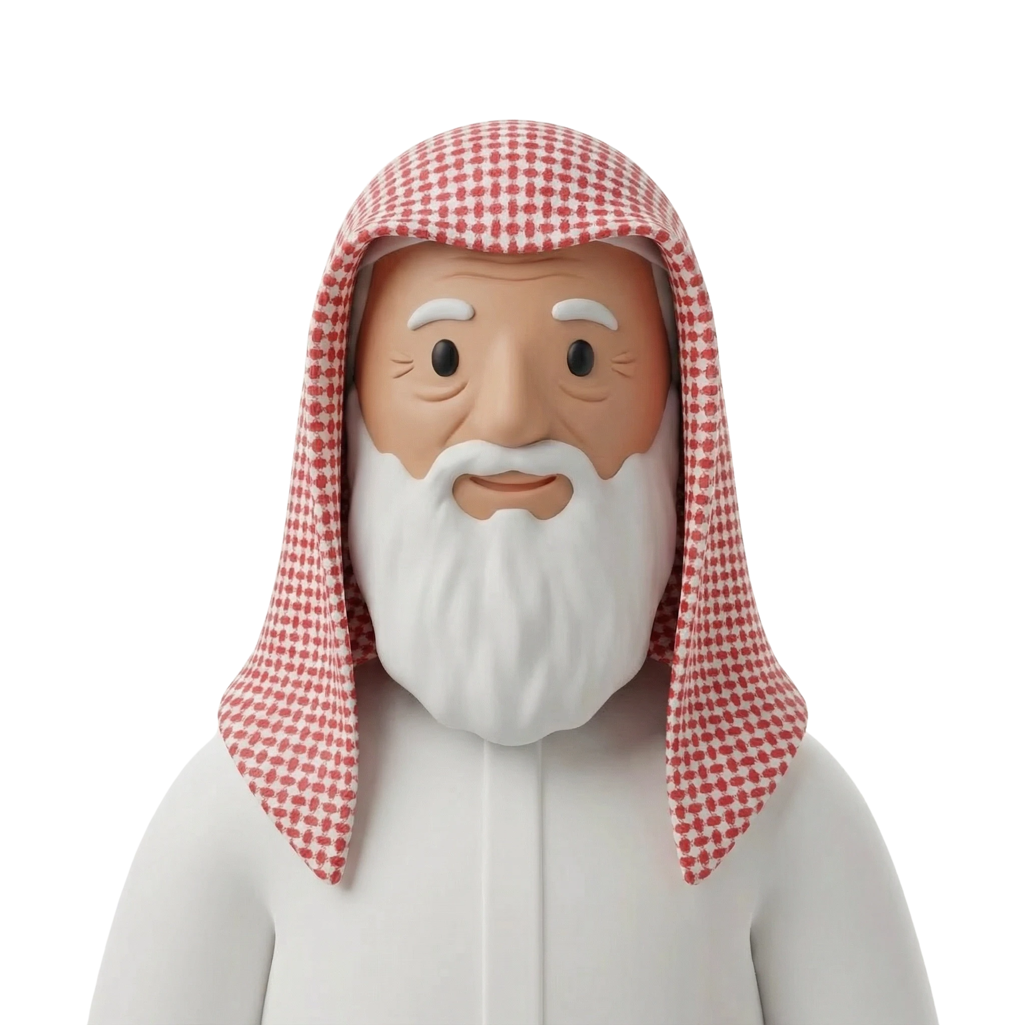 عالم مسن يرتدي الزي السعودي التقليدي، يعكس الحكمة والفخر الثقافي، ويُمثل الحفاظ على المعرفة والتراث.