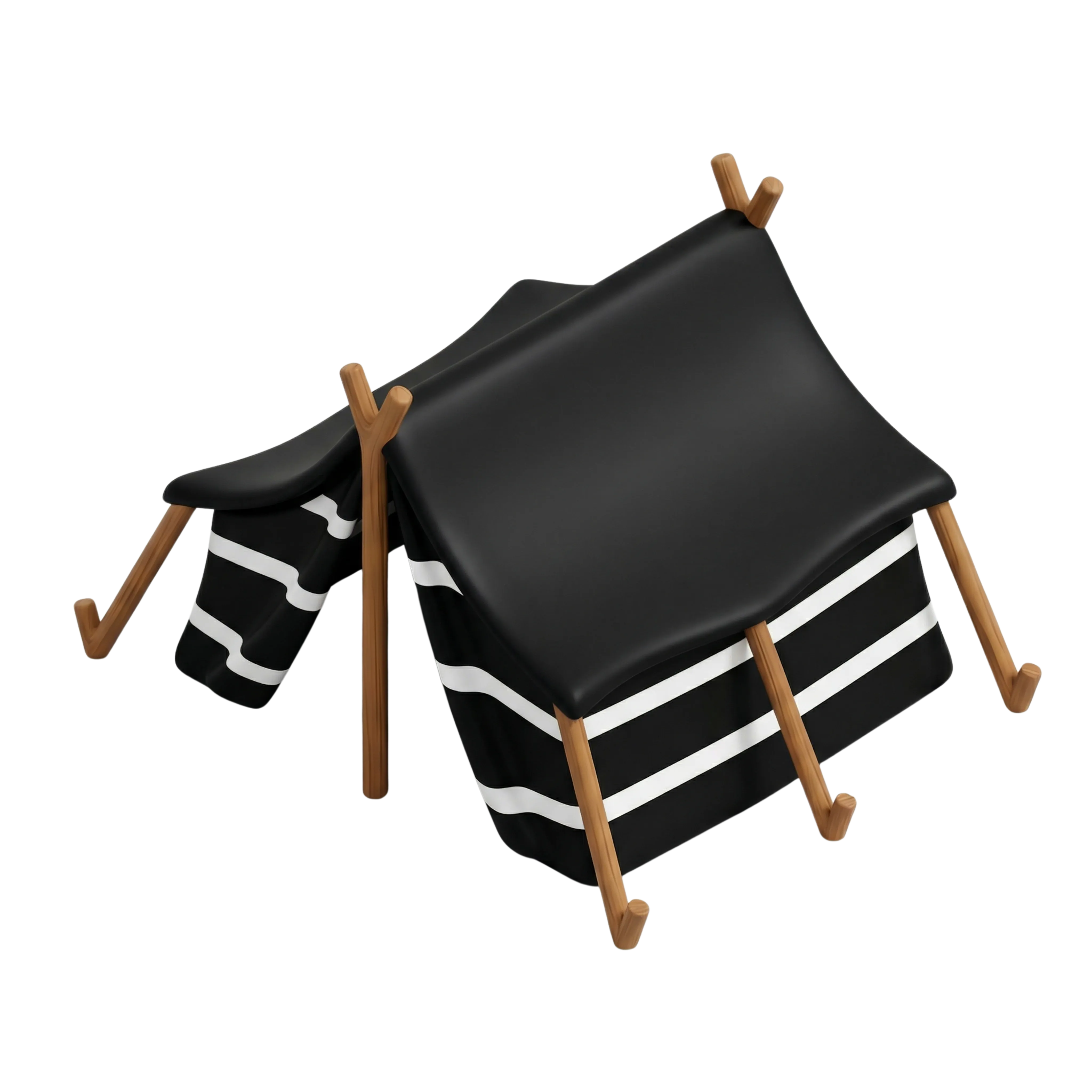 مجسم ثلاثي الأبعاد بتصميم فني لخيمة بدوية تقليدية باللون الأسود مع خطوط بيضاء وأعمدة خشبية. تُستخدم تاريخيًا في صحارى الجزيرة العربية، ما يجعلها مثالية للتصاميم الثقافية أو المشاريع التراثية والسياحية.