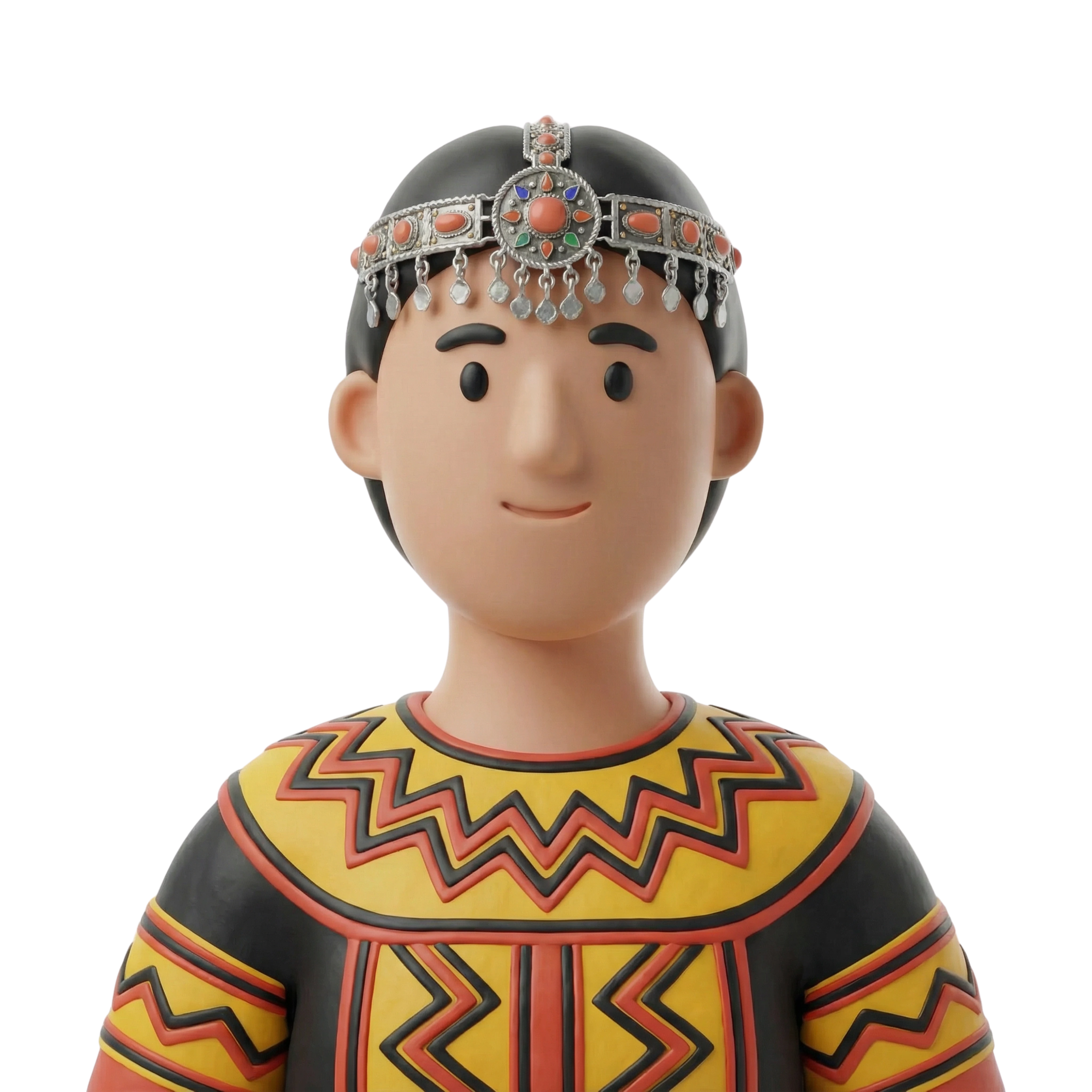 امرأة قبائلية بفخر ترتدي الزي الأمازيغي التقليدي، تُبرز التراث الثقافي من خلال تطريزات هندسية وزينة فضية مزخرفة بالمرجان والمينا.