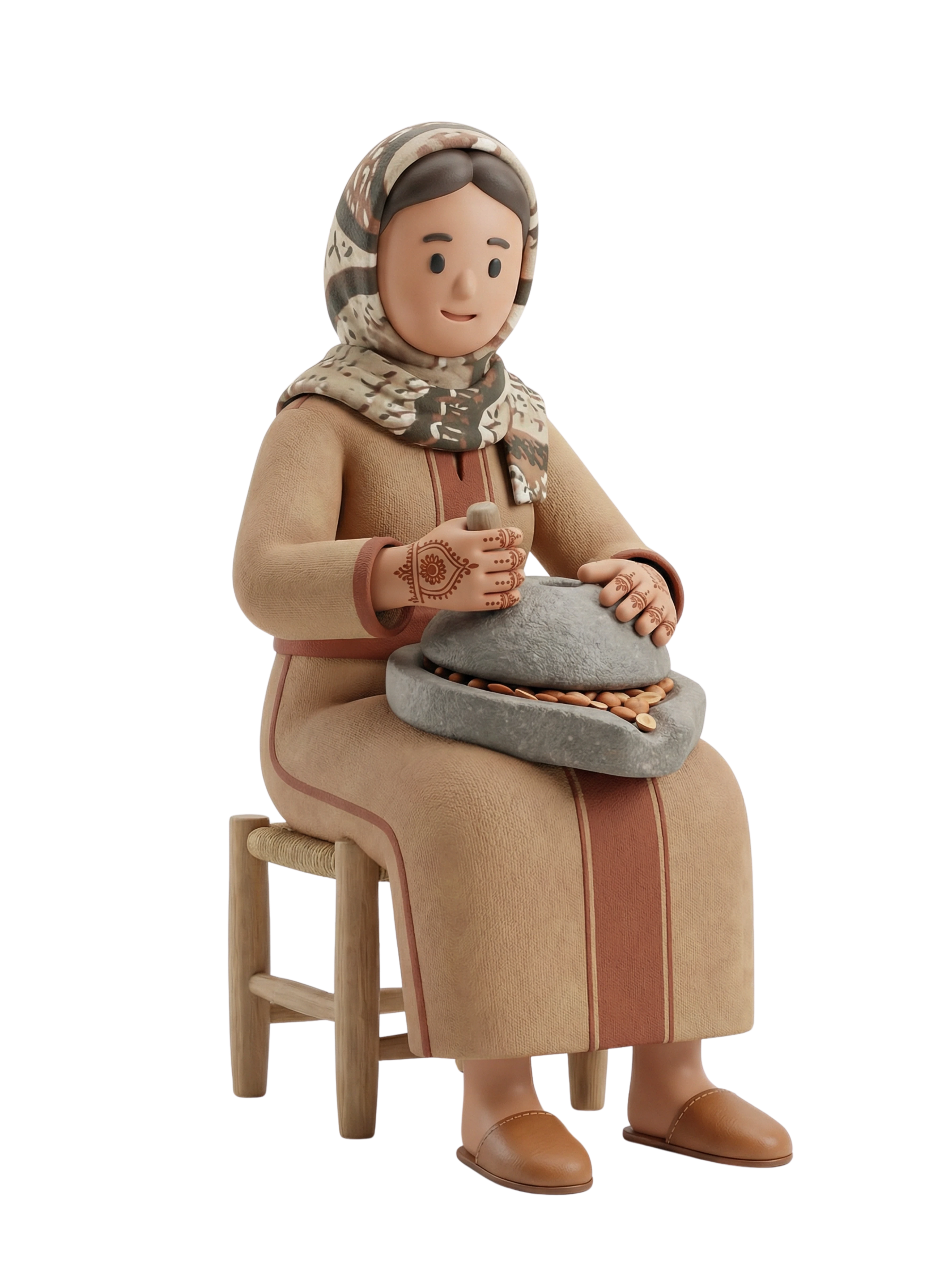 امرأة مغربية ماهرة تُحضّر زيت الأركان يدويًا، تُجسّد الحرفية التقليدية والتراث باستخدام الرحى الحجرية والزي المحلي الأصيل.