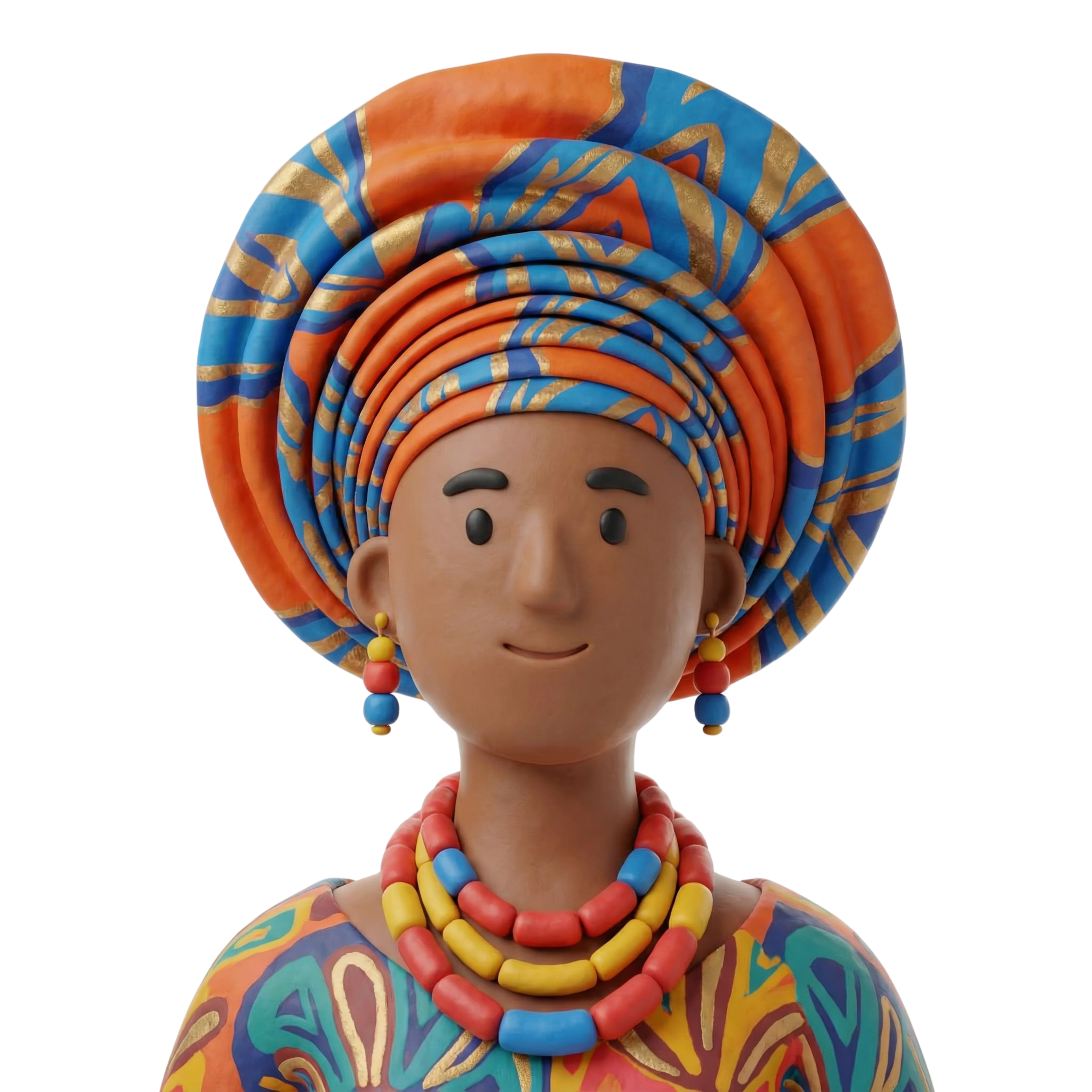 سفيرة ثقافية تعكس بفخر تراث غرب إفريقيا من خلال زيها الزاهي وحليها التقليدي، ما يعبّر عن الهوية والاحتفاء الثقافي.