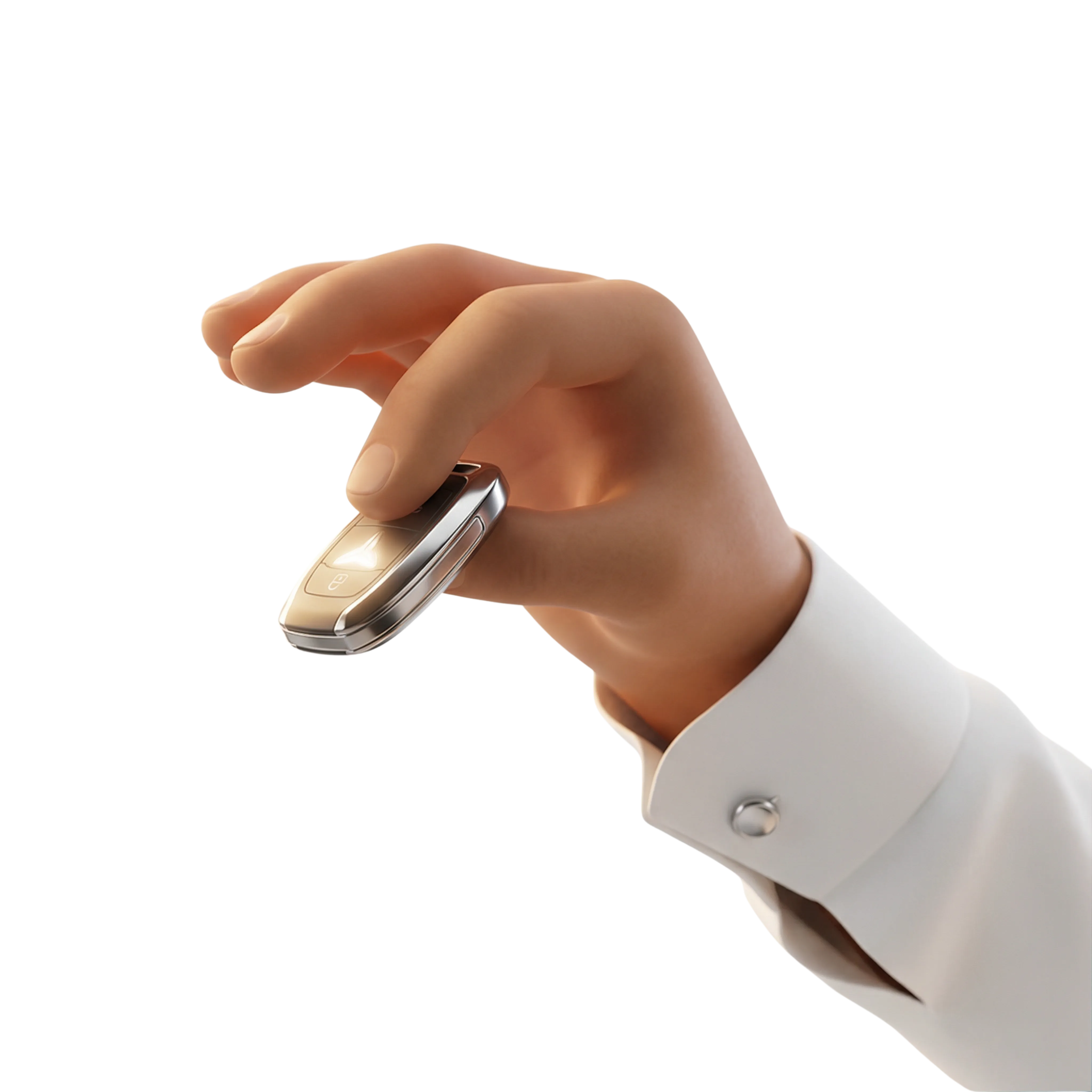 A high-resolution 3D render of a human hand holding a luxury car key fob with a metallic and glossy finish. The key fob features modern design cues and is ideal for automotive visuals, tech-related user interfaces, and luxury branding.