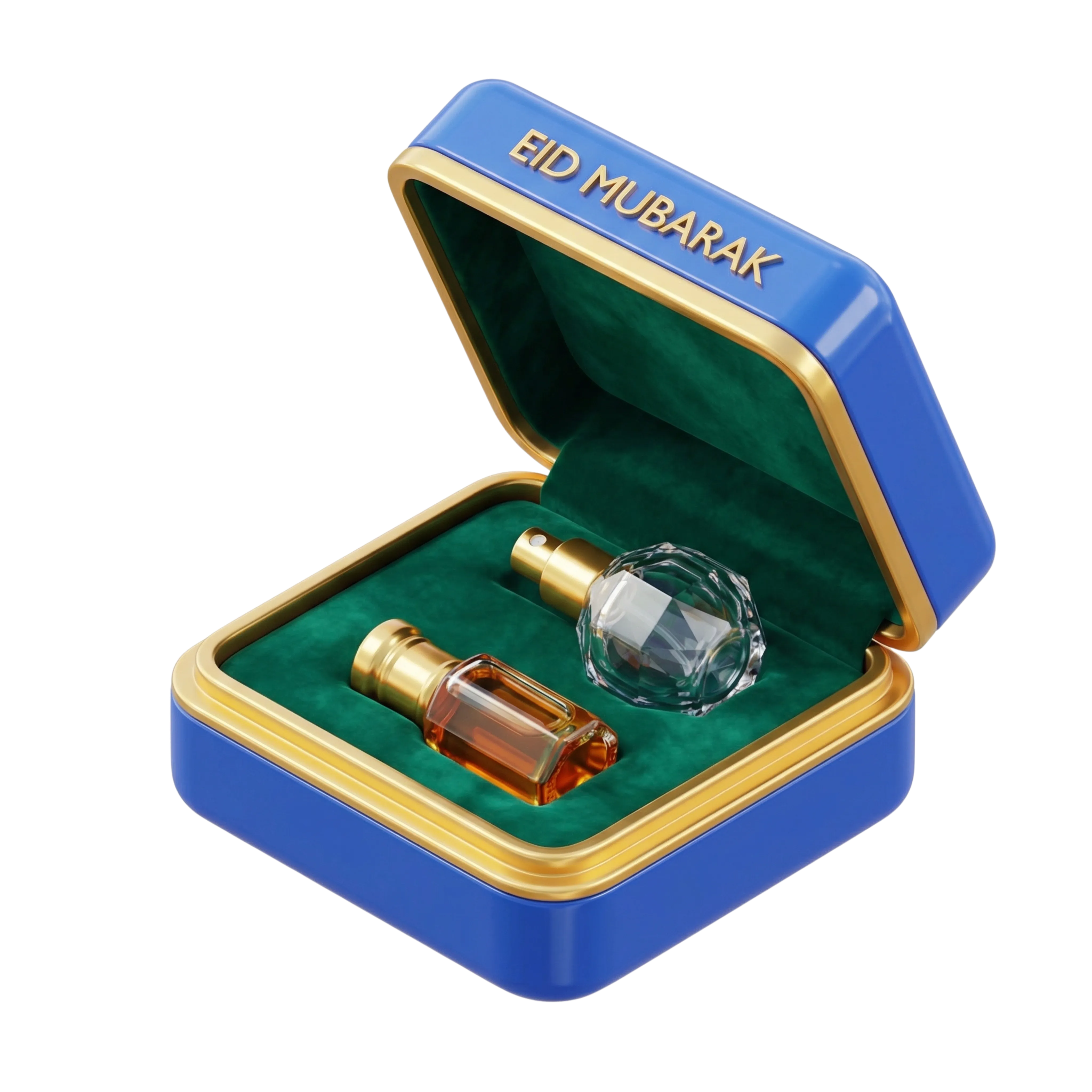 مجسم ثلاثي الأبعاد عالي الجودة لصندوق هدية فاخر باللونين الأزرق والذهبي ببطانة مخملية خضراء يحتوي على زجاجتي عطر بالعود مزخرفتين، الأولى بغطاء كريستالي أنيق والثانية بسائل كهرماني اللون، مناسب لتصاميم ثقافية، عروض دعائية، أو نماذج منتجات فاخرة.