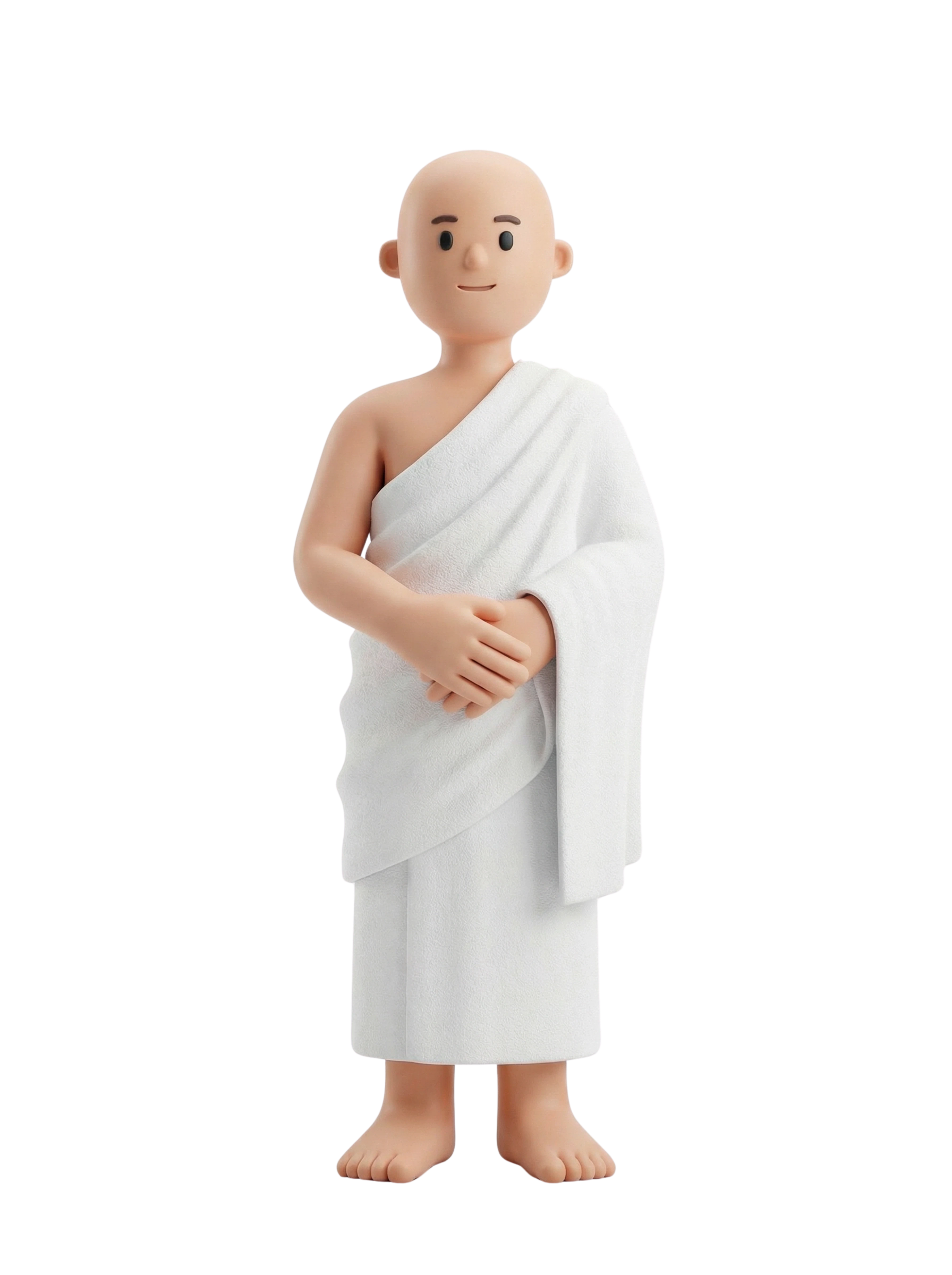 حاجّ متفانٍ مستعد لأداء فريضة الحج، يرتدي لباس الإحرام الأبيض التقليدي، يعكس الالتزام الروحي والتقاليد الإسلامية.