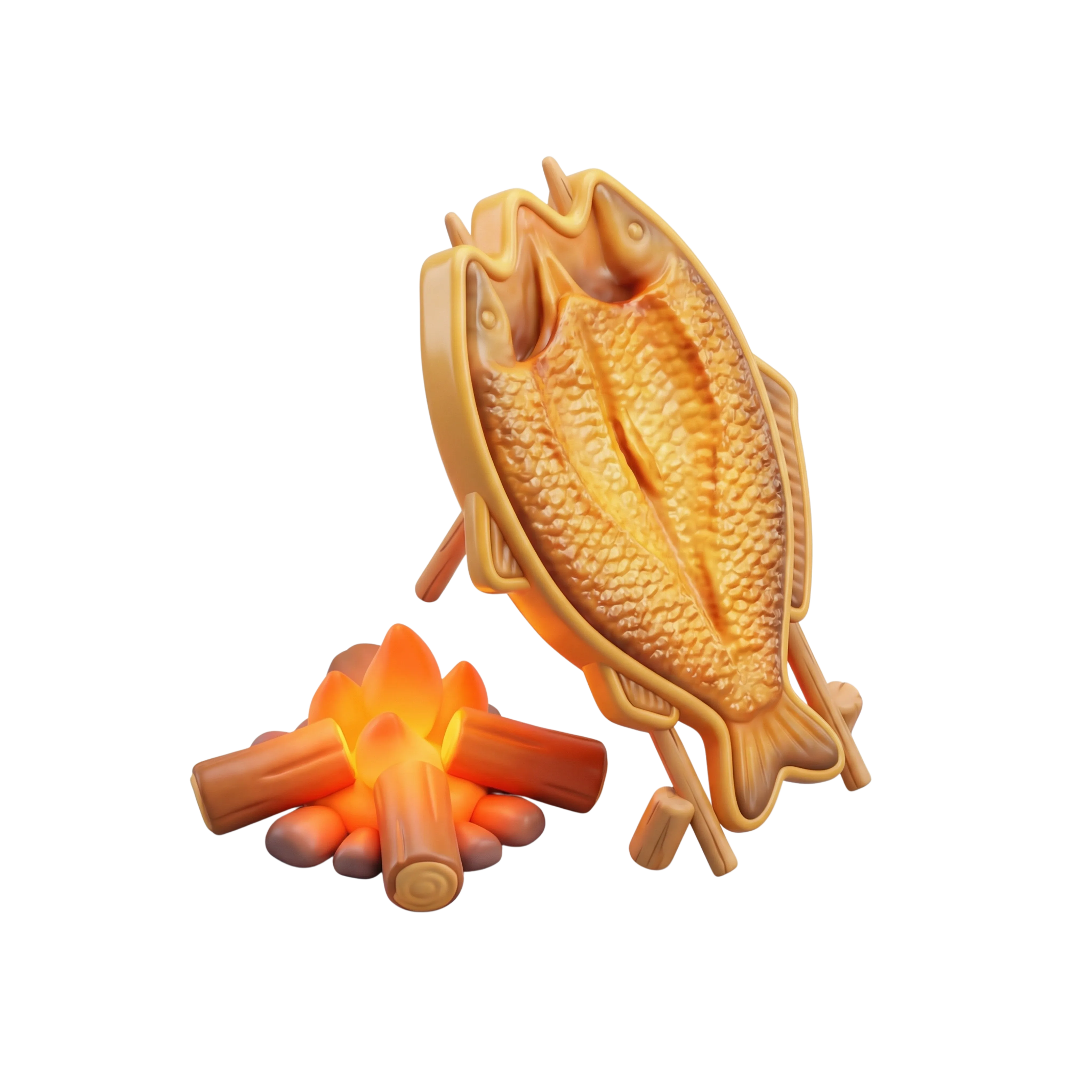 مجسم ثلاثي الأبعاد عالي الجودة لسمكة المسگوف التقليدية تُشوى على نار مفتوحة. يظهر المجسم بملمس مطفي مع لمعة خفيفة تعكس الطبخ، ومثبتة على أعواد خشبية بطريقة عراقية أصيلة. مناسب لتصميمات ثقافية، تطبيقات الطبخ، أو مشاريع تعليمية.