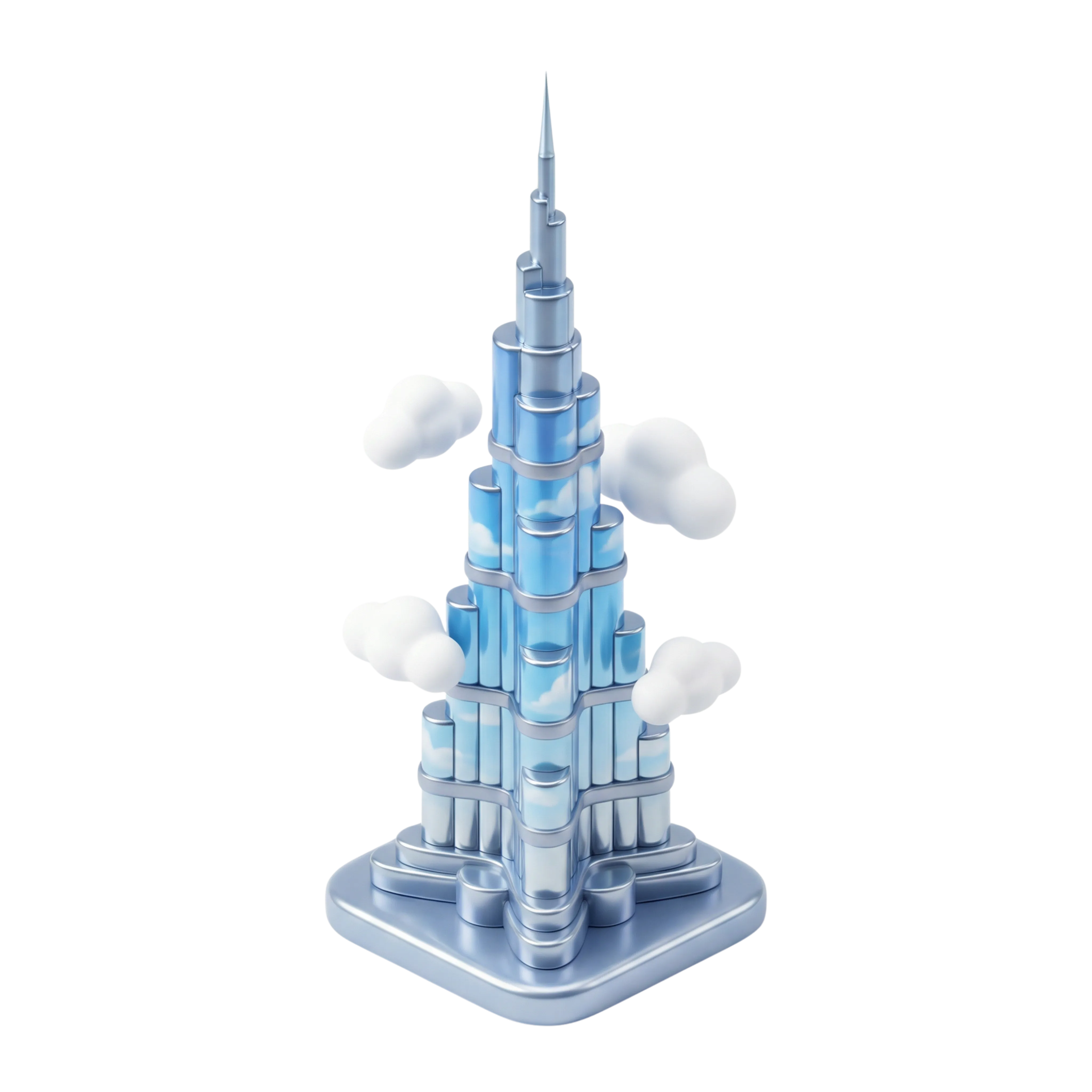 مجسم ثلاثي الأبعاد عالي الدقة لبرج خليفة بتصميم معدني لامع وأسلوب كرتوني محاط بسحب ناعمة، مناسب لتطبيقات السياحة، العروض المعمارية، أو الهوية الثقافية لدولة الإمارات.