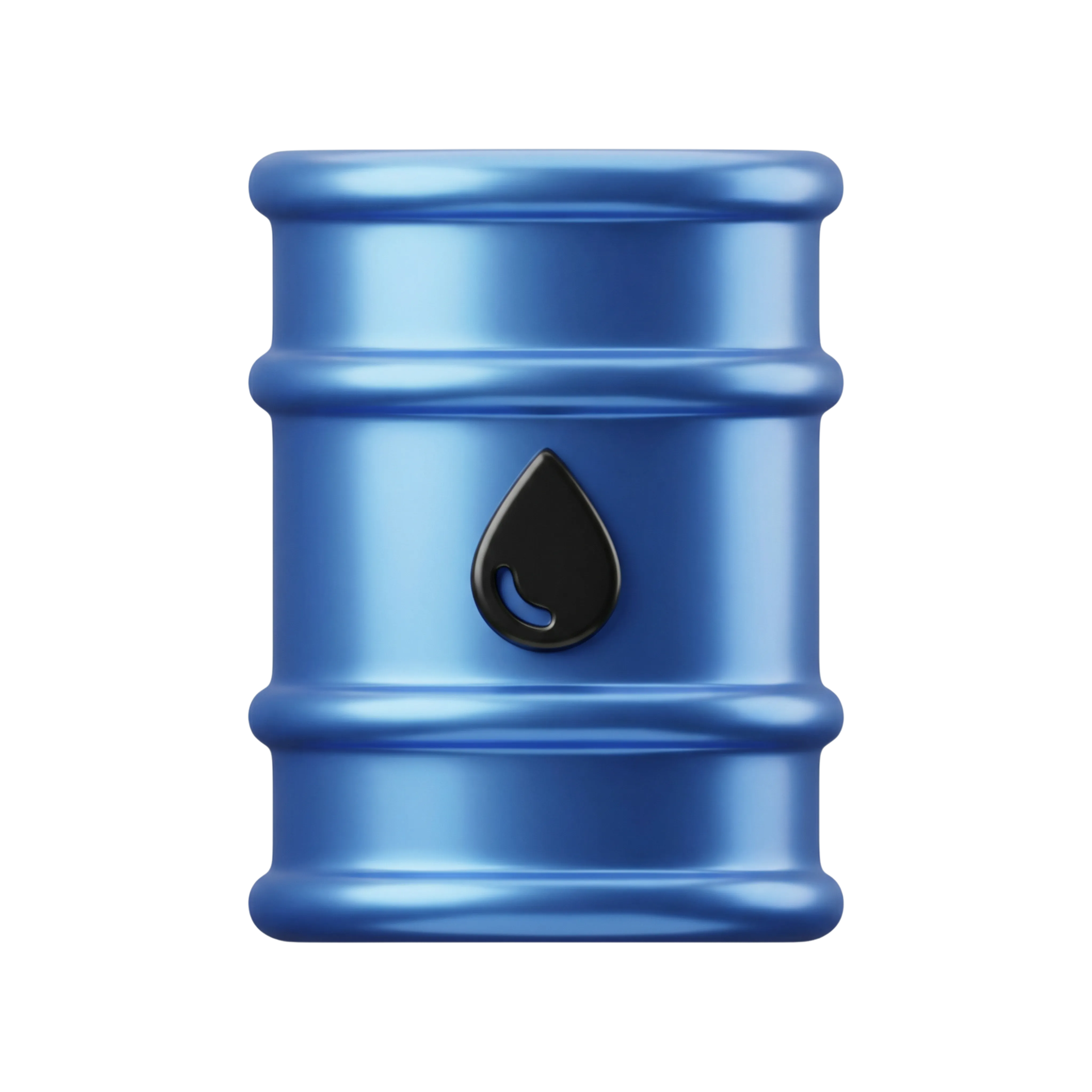 A detailed 3D render of an oil barrel with a reflective metallic blue surface and a black oil drop emblem. This stylized icon is ideal for energy-related infographics, dashboards, apps, and industrial UI/UX designs.